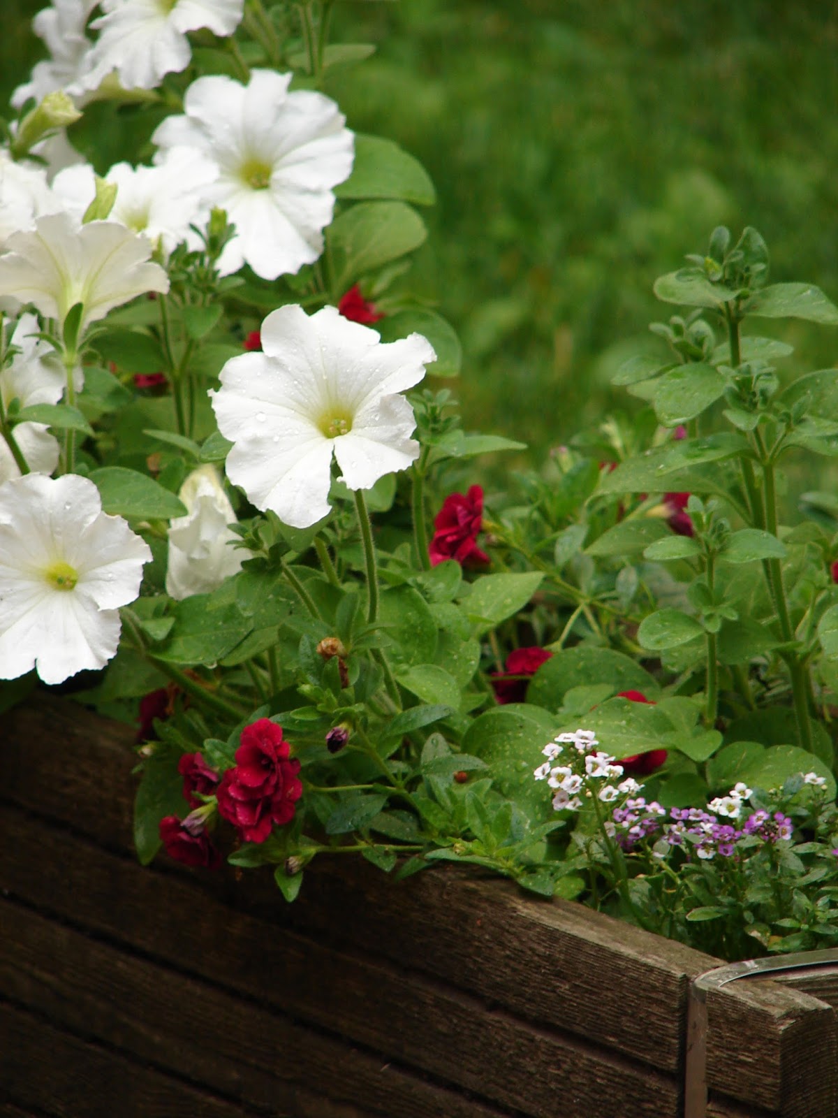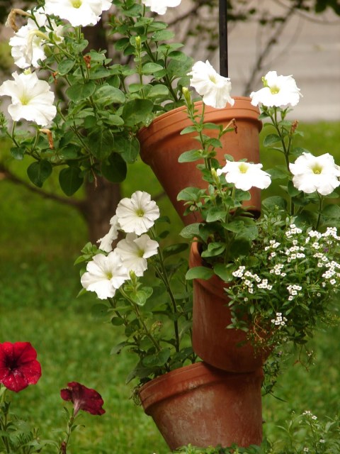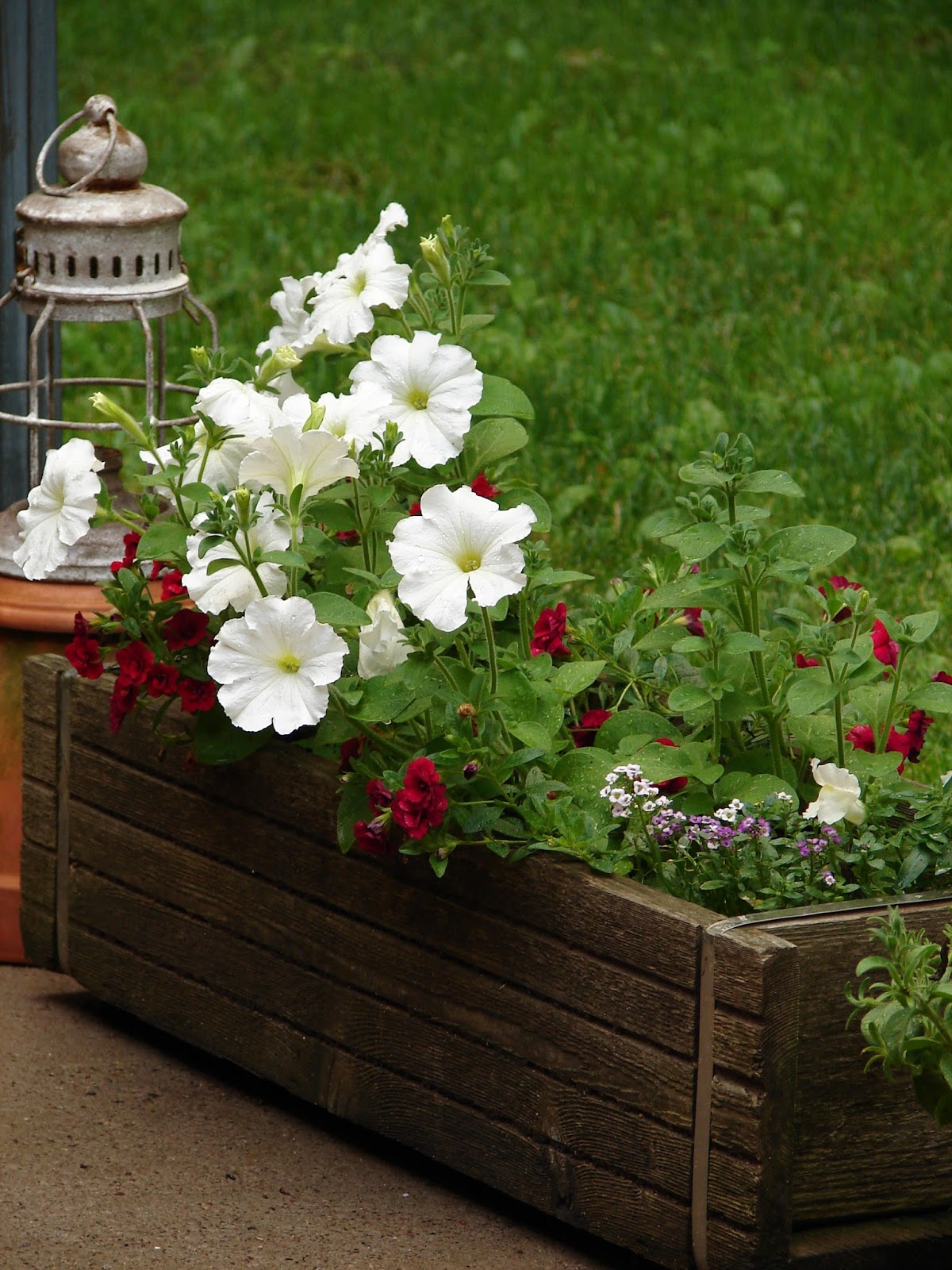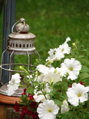 I used new better soil for the pots and decided to use only reds and whites and only a little blue for flower colors. Whites show up nicely in our little secluded spot and the reds ramp up the show effect. Mom used red and white petunia flowers at the farmhouse long ago and I’ve never found a way to improve on that.