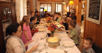 Wednesday night, while other people, who I won’t mention by name,went to prayer meeting; Elv and I lined three tables up in a long row right down the middle of the house. We played musical chairs with them till we got them arranged for the best space possible which was still pretty tight, and covered them all in white cloths to become one long table. Then we spent an hour placing the name cards I had created with the Cricut on Monday. I was so glad for his help with this. With two of our families missing, we still had nineteen people, nine of which are children ages eight years old and under. Try this sometime. Remember we are going to be passing heavy dishes of meat and taters and sauces and what-have-you from person to person. So we need to have the adults interspersed evenly. Anyway, we got it done and it worked, even though I still had to get up and help pass dishes. Clark frankly stood up at his end of the table to get it done.