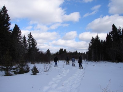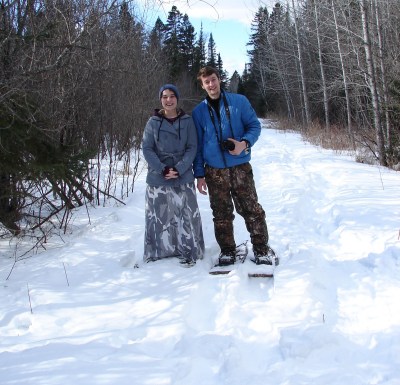 What we really wanted to do this time was snowshoe. By refurbishing Elv’s old bear paws from logging days, and Brad buying a new pair we each had a pair of snowshoes. Elv fitted Amy’s boots into the old bear paw shoes.
