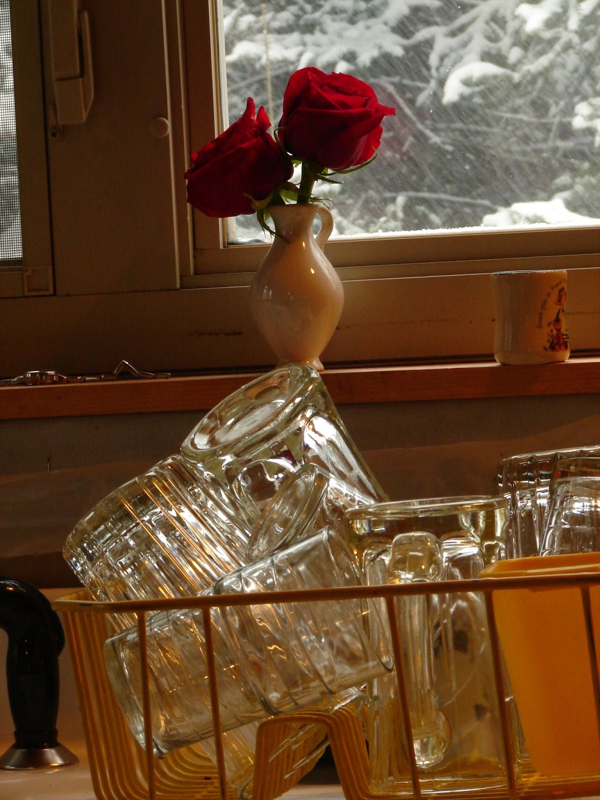 I love our arrangement. He cooks and I clean up. Besides, he installed a cabinet with a ceramic sink in the kitchen right after breakfast Saturday morning and hooked up the drain. So even though we still have to dip hot water from the reservoir in the cookstove to wash dishes, we don’t have to haul it outside to dump anymore.