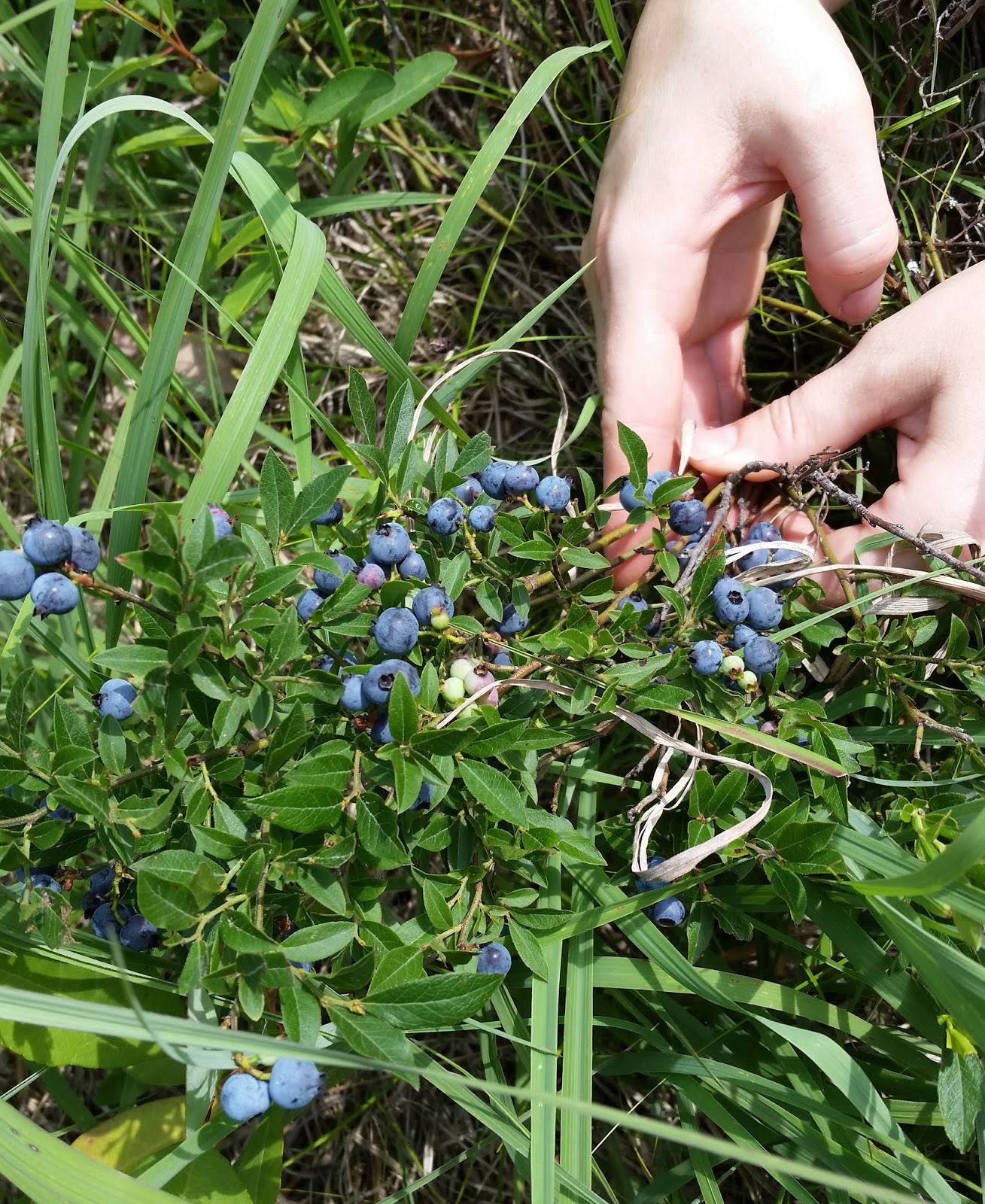 Would they really be here? We had picked them twenty years ago here in these sand lands of northern Wisconsin. So I kept searching in the almost-shade of low shrubbery, small trees, just off the trail, in a sweeping line into the trees and back to the trail. Eventually I found them them, blue at my feet here and over there. Yes, I shouldn’t have doubted. I knelt down in the grassy, spongy softness of a jack pine forest long gone, settling in to gather them gently using both hands.