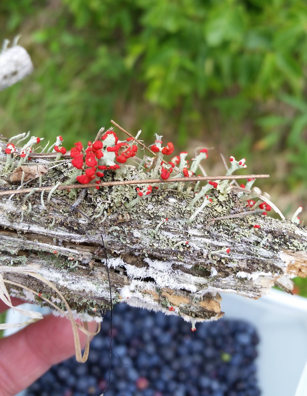 We saw where the bears had swiped off the tops of ant hills, and where they or other pickers had cleaned up whole patches of berries. We saw that the hazel nuts are making fruit just fine. I took pictures of irresistibly, beautiful red lichen on an old stick of jack pine. On closer inspection, I counted three kinds of lichen growing on the stick.