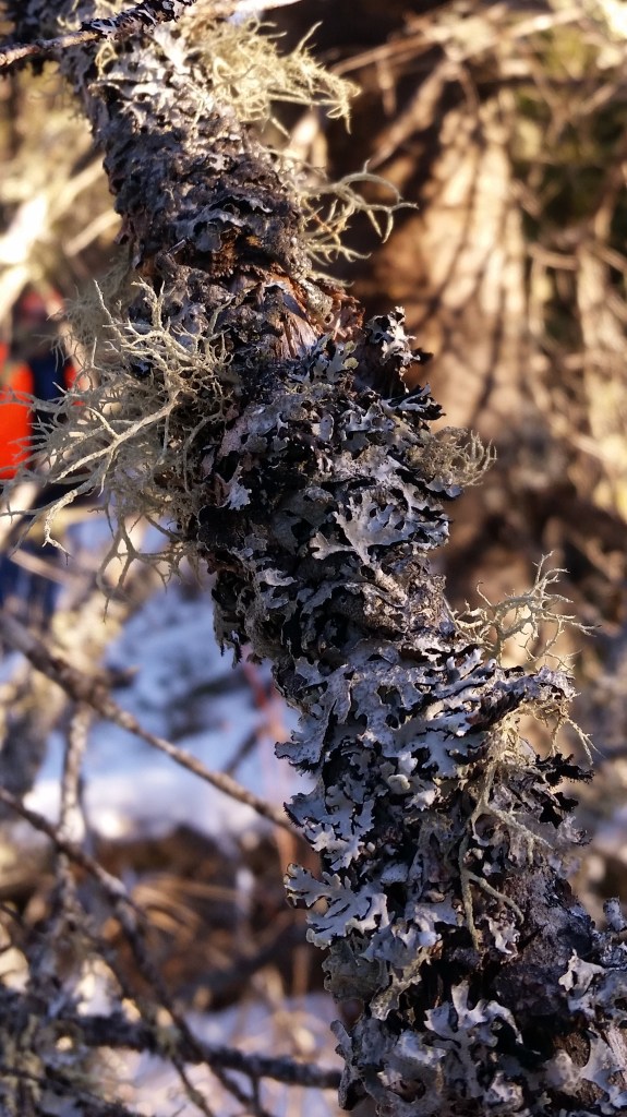 Lichen is fascinating. It appears to need to grow in at least threesomes of varieties on the same bit of decomposing wood or clinging to shallow soil on rocks. Interdependent, like we are, as people. All winter it holds on and feathers this dead spruce tree from roots to treetop. One of these days the tree will topple and crumble on to the forest floor; lichen still clinging and thriving. Next spring the lichen will be the first to green, flower, and grow. For the careful observer there will be fairy gardens among the melting patches of snow. I’m likin’ the lichen. It is not unlike the hope that waits inside my mind while Christmas approaches. The clouds will break, too, one of these days. They will.