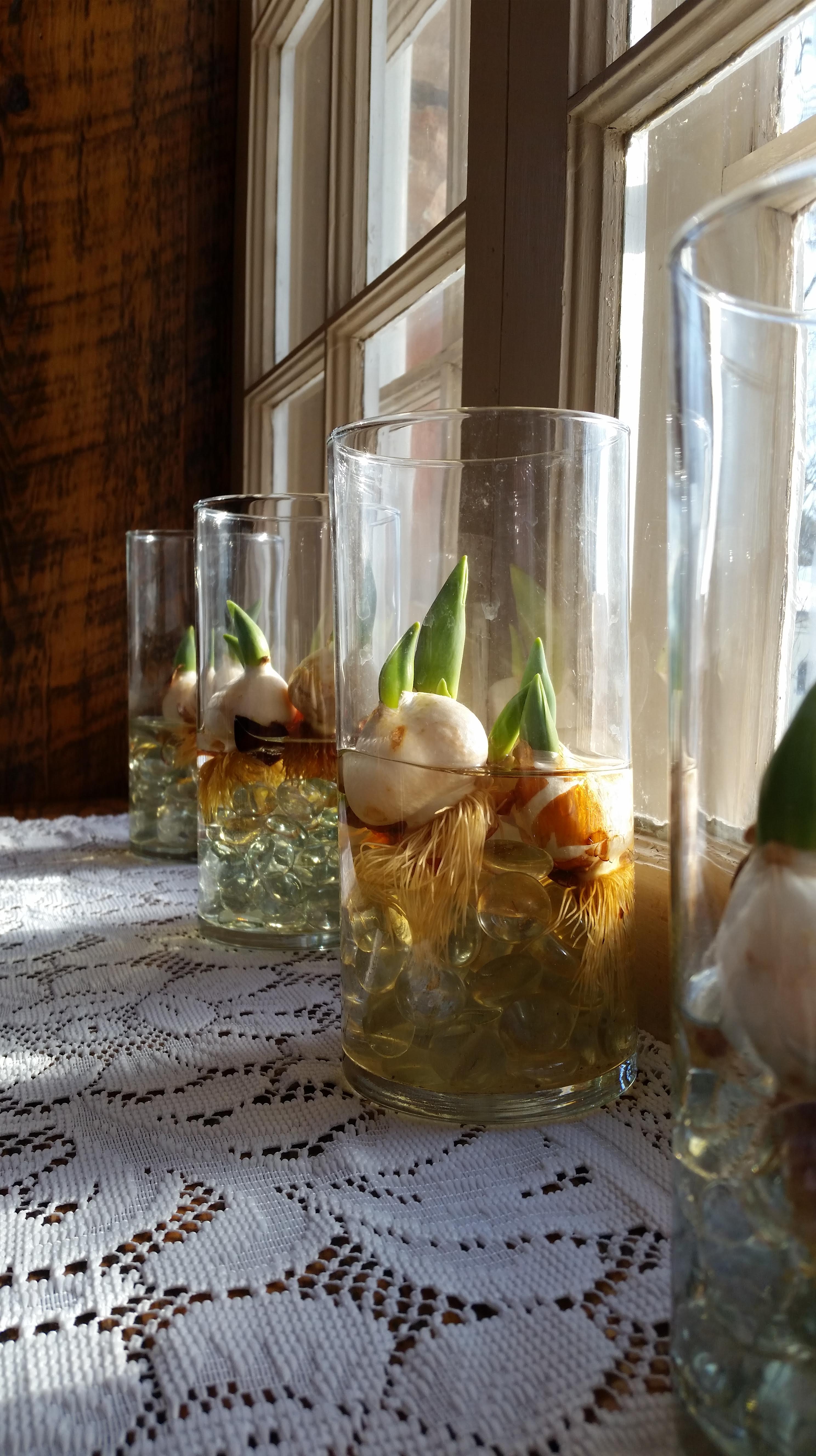 I had tulip bulbs given to me last fall and I had every intention of planting them immediately. I was so excited about them… yet there they hid, under the desk in a cardboard box forgotten where it was cold and drafty. By the time I rediscovered them they had decided that spring had come and were pushing shoots. Will I have tulips blooming in a few weeks? In the end, I decided, even if they never make it to blooms I’ll have had great fun watching them grow on the windowsill.