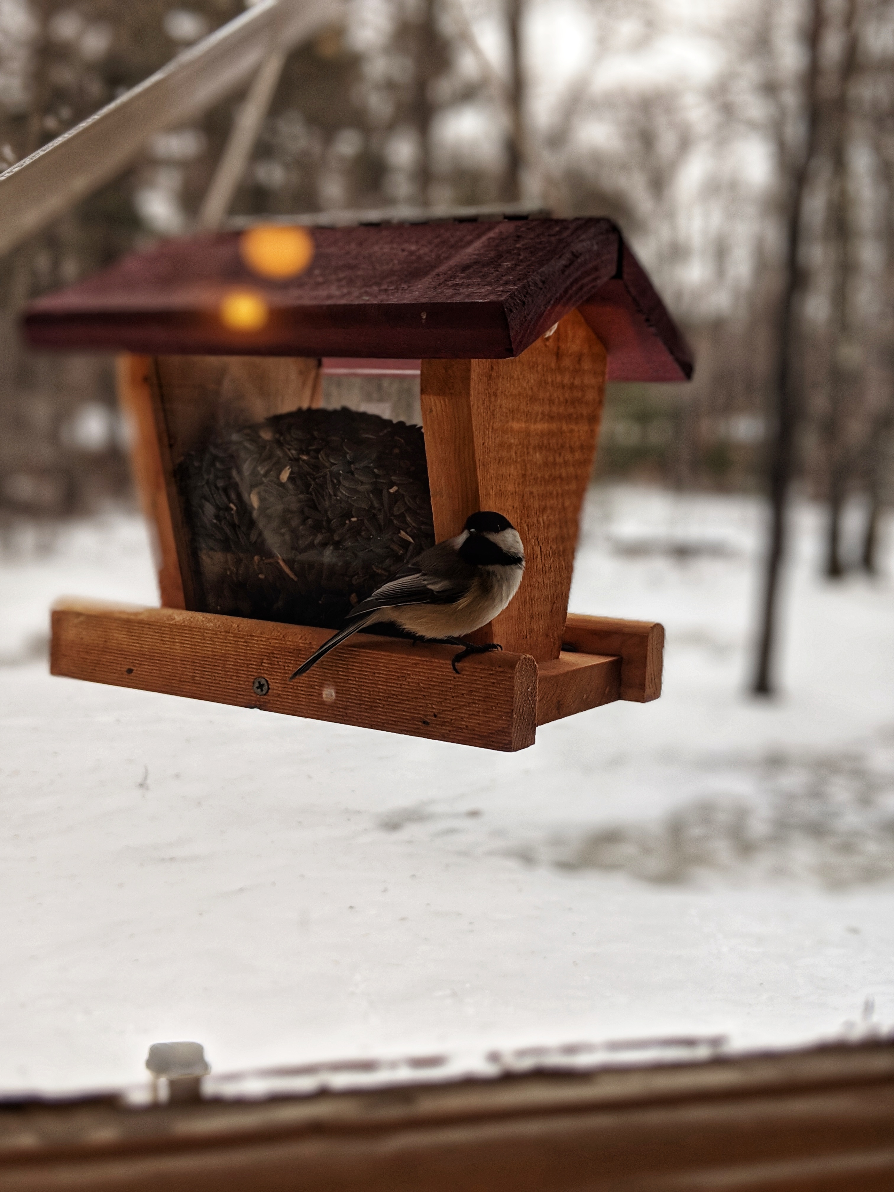 ~ The nice camera on my “new” phone is amazing. I have no trouble taking joy with being able to take close up pictures of a chick-a-dee.