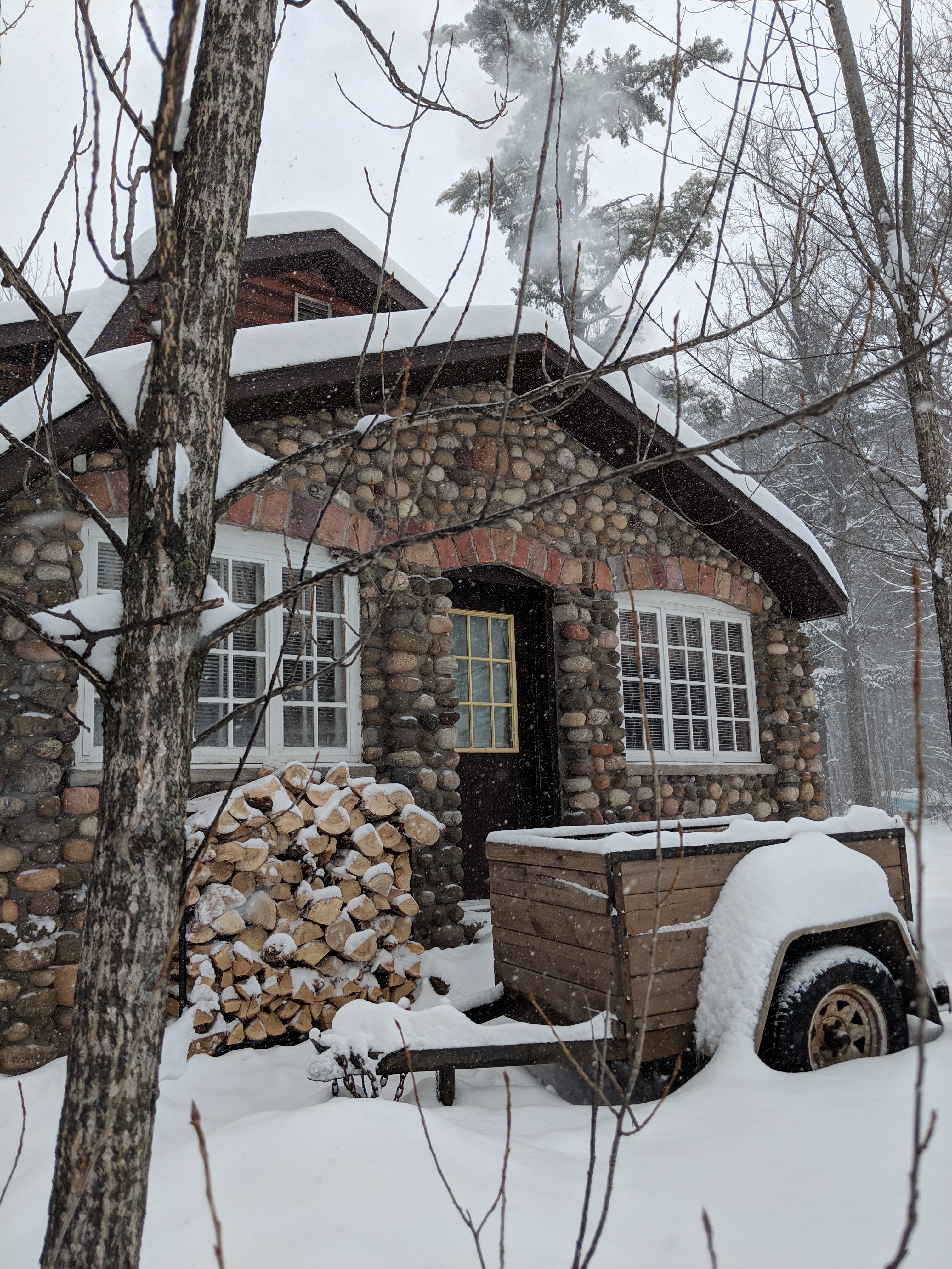 Today I’m moving between housework and reading my book every half hour, because I can. The only deadline is that tomorrow is Sunday and perhaps I should mop floors and prepare food. The book is one of my teen-aged treasures about a couple who took to the woods and lived in the British Columbia wilderness along the Peace River. I realize now that I must have been influenced by this and other books like it; because I love living in the woods and exploring the rivers and lakes. But I was talking about our week and a quiet Saturday at home. The whole week ran along the lines of firewood chores, which I enjoy, the store re-set, and cold weather problems like bad roads, plowing, besides making drawings and lists about reducing our two cabins of worldly goods to fit into one cabin, tastefully and functionally.