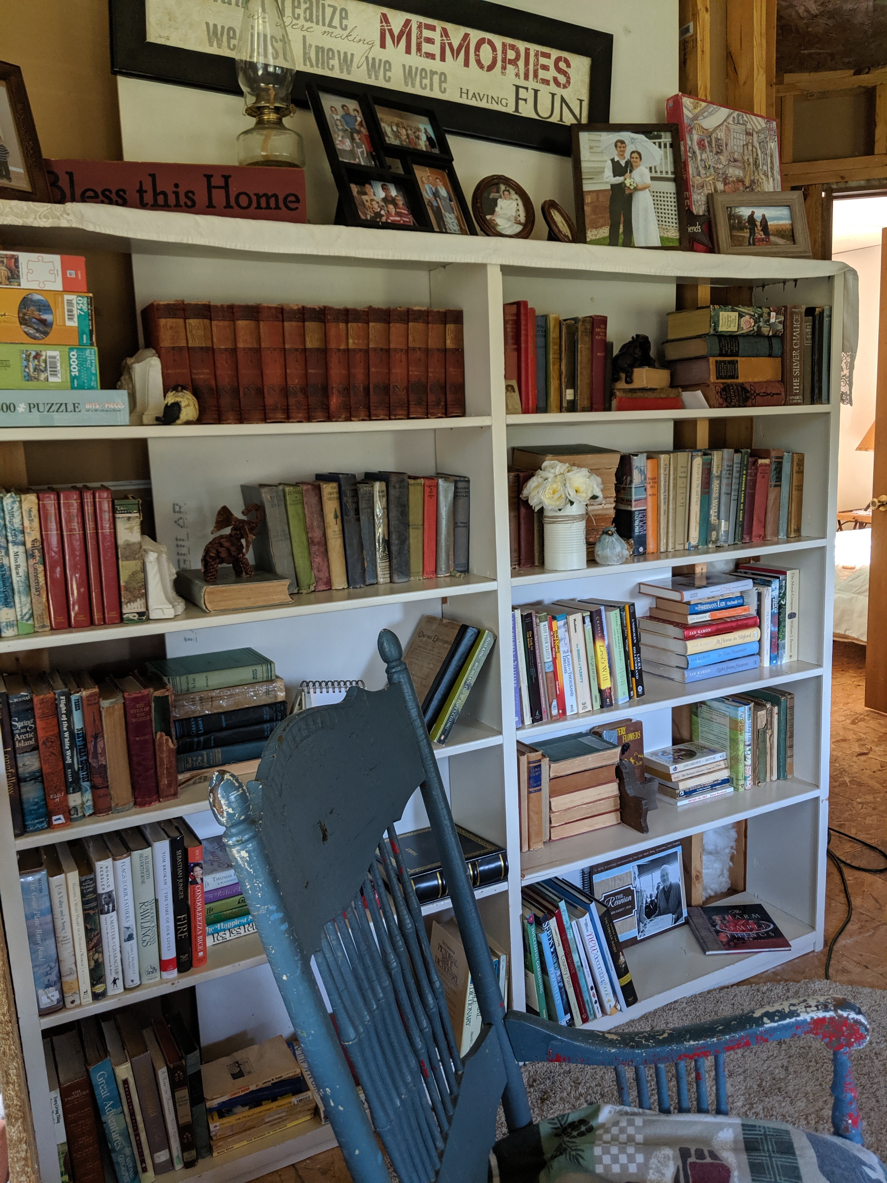 “Oh yes!” I chimed in, ” I know exactly where I want them.” So we boxed up the books and Brad took both bookcases entirely apart and packed them up to ride with the books in the bed of his pickup for going north next day.