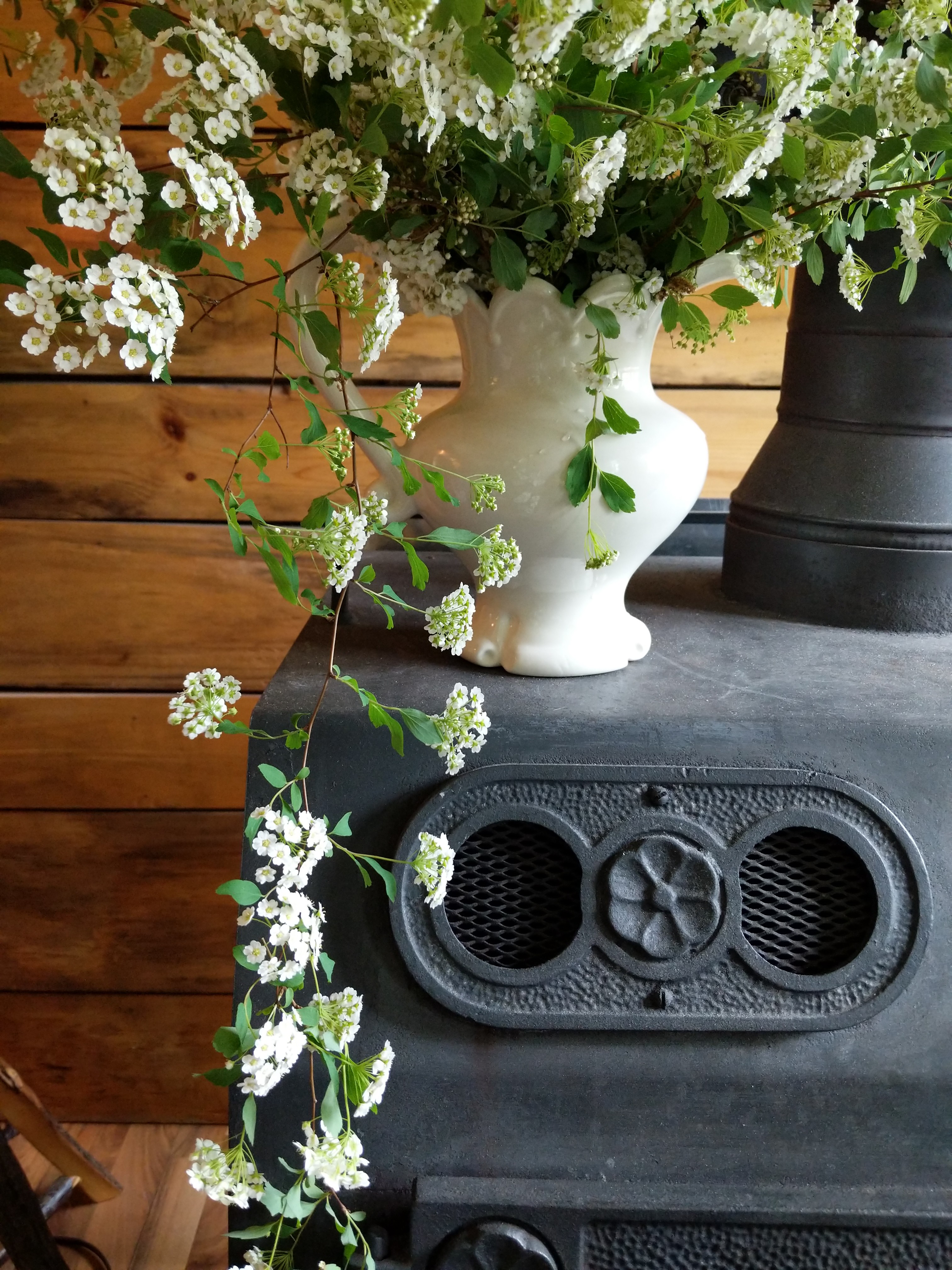 I just got back from raiding the empty lot down by the lake. There’s a beautiful spirea bush there that blooms in fountains of spilling white on to the road pavement. I was going to take my bike, but the tire is flat. In the car, driving slowly, looking in on the neighbor’s gardens and building projects mid-morning on Wednesday is ridiculously interesting. These days of being able to work in the garden or putter about the neighborhood looking for forgotten bushes full of flowers to pick for my vases are rare.