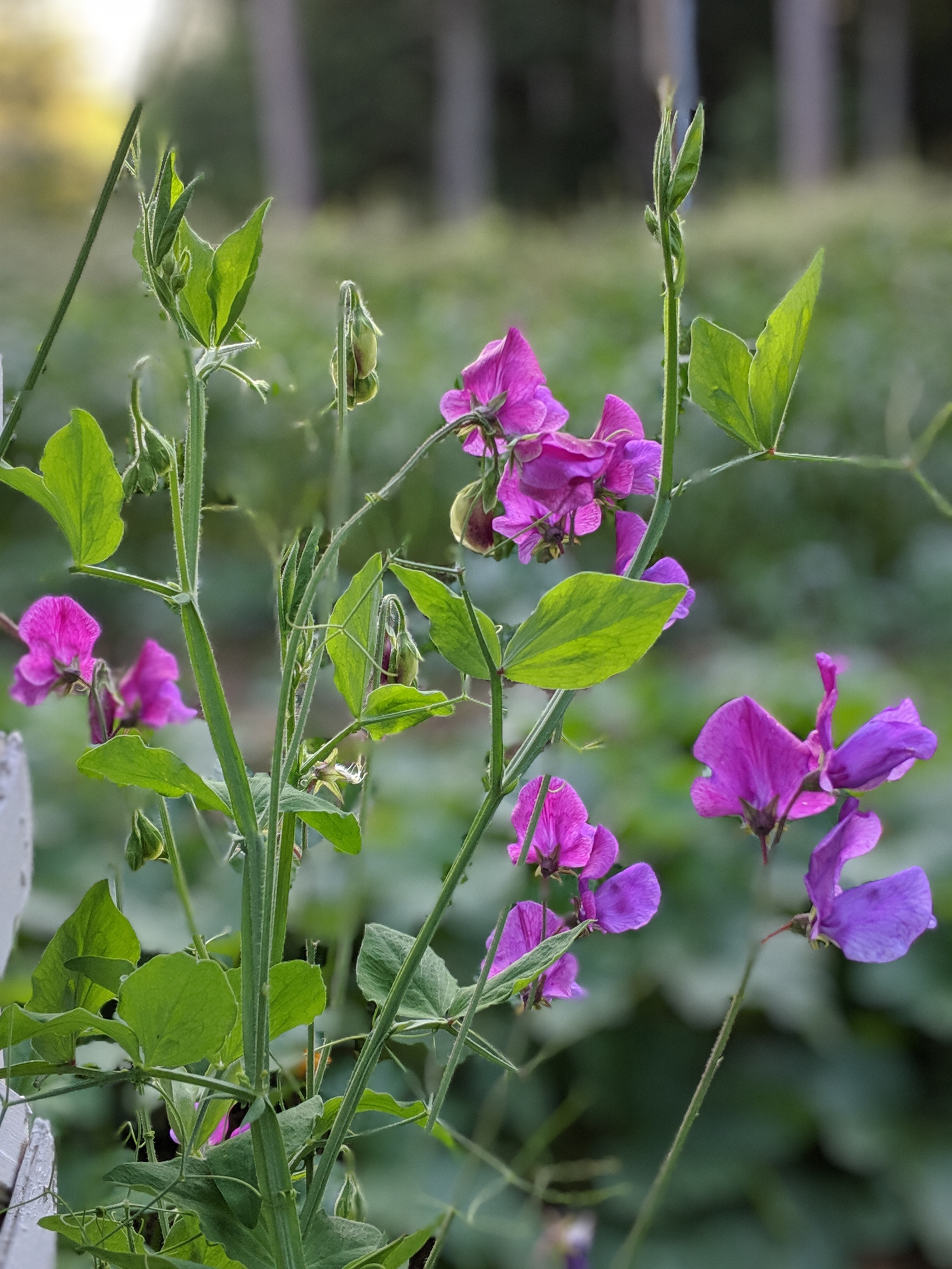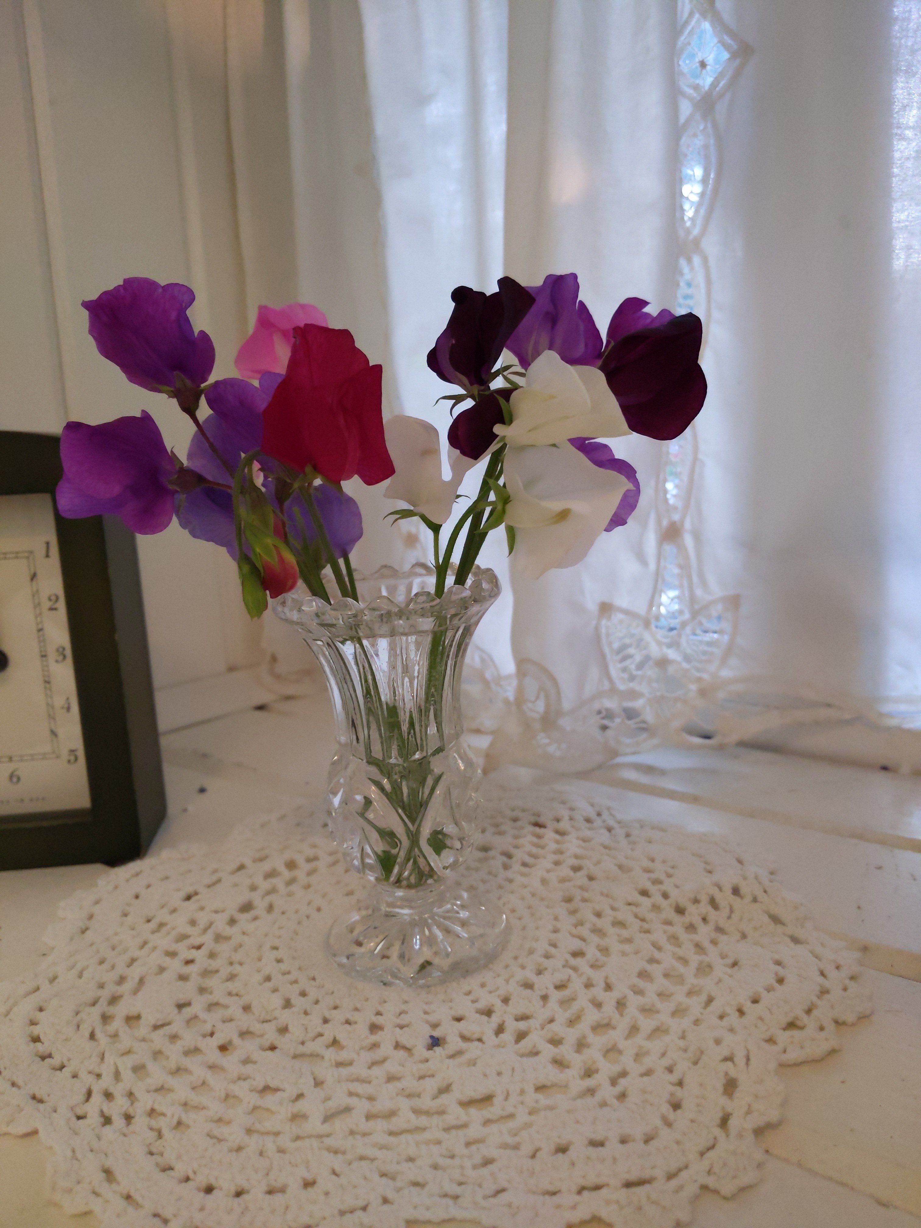 The sweet pea flowers are one of those unexpected pleasures this summer. I started them from seed in March on a living room window sill. They grew spindly, pale, and leggy-tall. Kind of silly really, and when I transplanted them to garden beside the trellis it was strictly because I had invested so much time and yearning already I had to try. They were slow growing. But with watering and more yearning and fertilizers they finally began to climb the trellis. What a miracle when they began to bloom. The sweetest fragrance ever comes from these apparently fragile flowers. Cutting them for vases only yields more blooms. Carolyn uses the word “exponentially”to describe how many more flowers come when you cut the first ones for vases. This works for all cut flowers: zinnia, cosmos, forget-me-not, purple cone flower, and the rest. So the moral of this story for me is to transplant even the sickly. Given the right conditions, they’ll grow and flower. And to fill the vases with the first few flowers, don’t worry, there will be more. Give of your first little blooms in life. There’s more coming, by giving.
