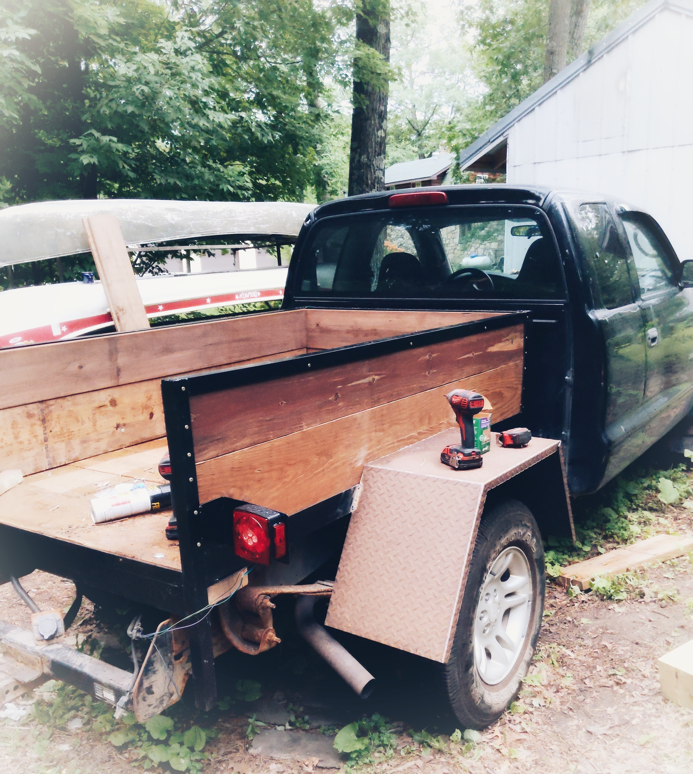 Every evening after supper, Elv has been going out to his open air shop to work on our latest happy project, which is to put a new bed made of steel and wood on the Dakota pickup. Its the pickup of Lance’s that Elv’s machine almost backed over the same week that Brad and I turtled the sailboat. The redemption of the pickup will be our much needed Jeep replacement. We will have a hauler for our projects and our going-to-the-cabin vehicle. It will be our excursion and going on an explore (dear ole Pooh) vehicle. I have yet to experience the redemption of my dunking in the lake that evening.