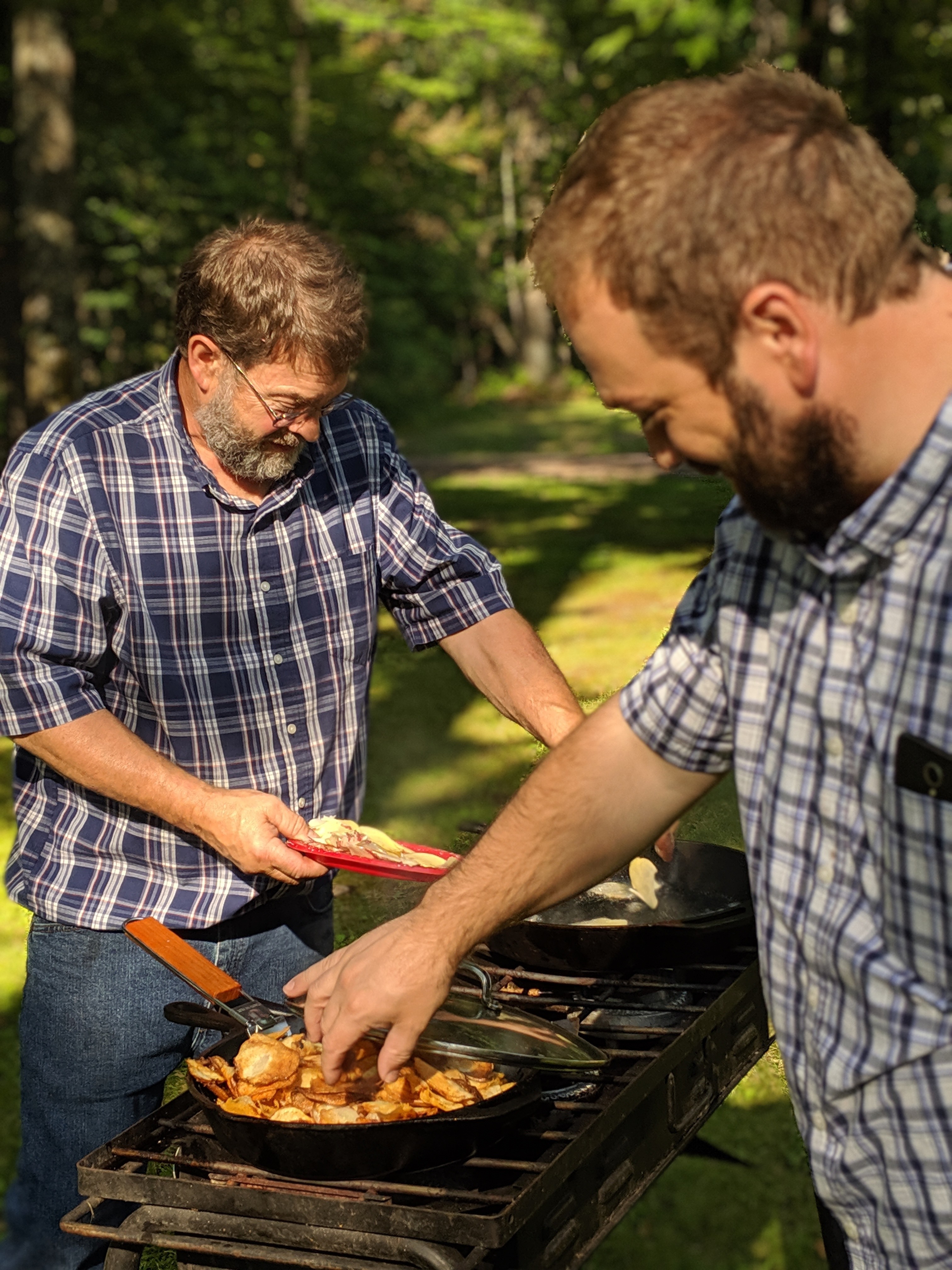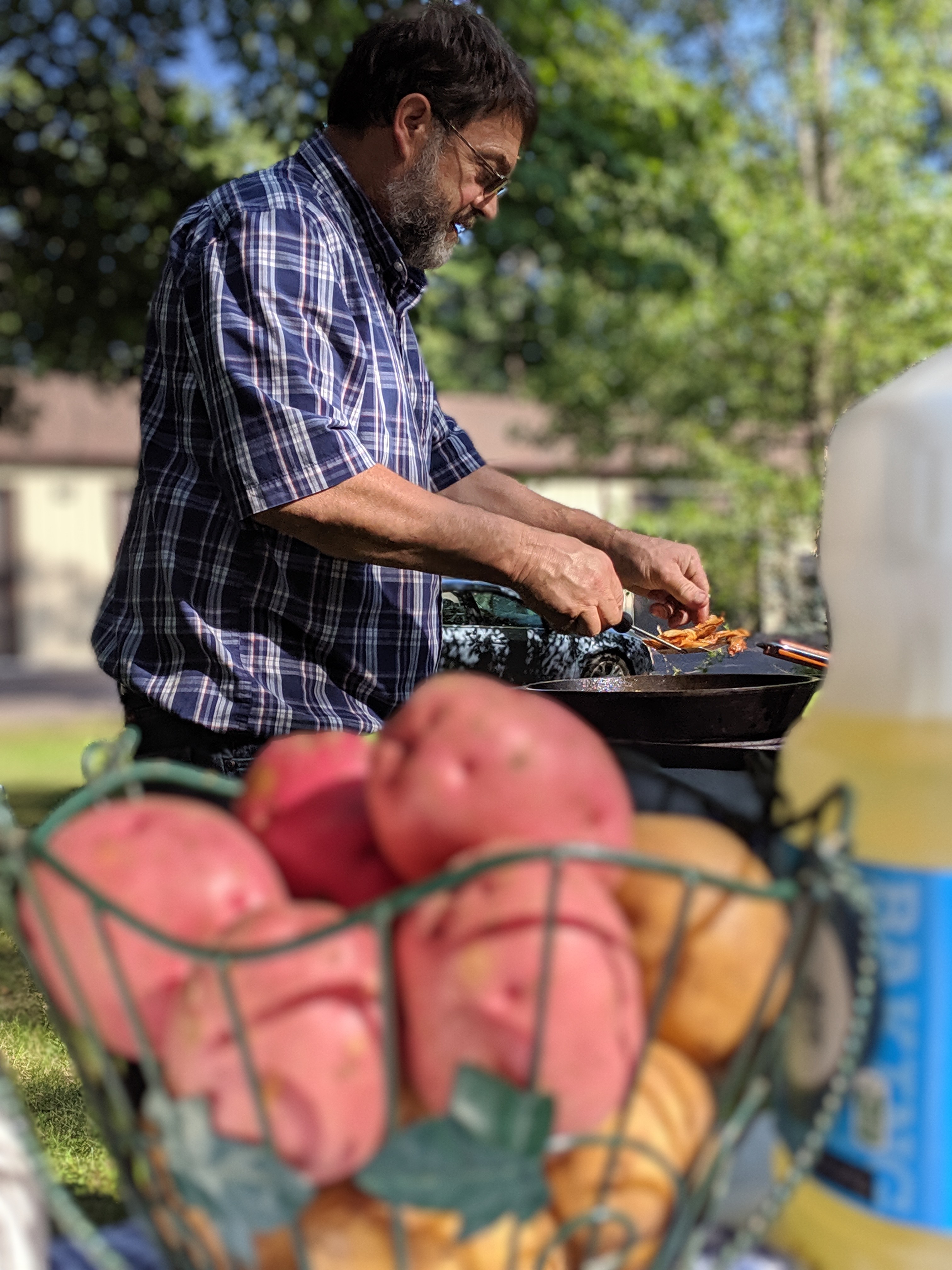Sunday night Elv made potato chips from new garden potatoes. Sliced thin and deep fried, then salted with sea salt, they are easily the best we’ve ever tasted. I love Elv’s serve when he’s cooking for the family or guests. Lisl says her husband is her favorite preacher. Mine is my favorite cook. We sat around the evening campfire till ten thirty. Jackets and coffee and talk.