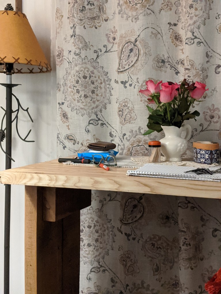 This little cabin has almost no room for a table. And a table we must have. At our house a table is the center of what happens at home. So we had to dream up a way to have a very small table that would work for our needs.