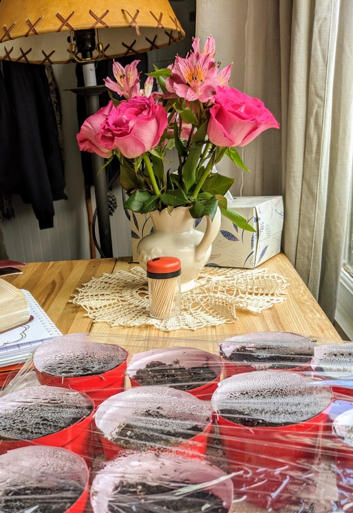 Yesterday I planted sweet peas into cut-off solo cups to plant by the garden fence in May. Right now the garden fence is snowbound with ugly sugar snow the edges of which are seas of mud. It really is spring, but gardening comes by faith at this point. So we believe and we start seeds in rows of small cups of dirt. More window sills than ever are loaded with space eating flats of hope. We ordered vegetable seeds and seed potatoes. So did lots of other more people than usual. Mr. Feed and Seed in Hayward took my name and number promising to call when the seed potato order arrives there.