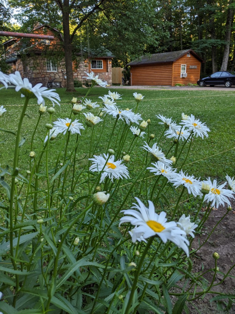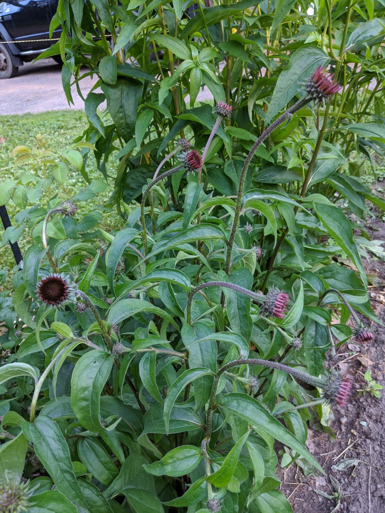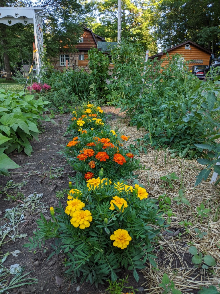 Garden daisies in whites are my favorite. Let’s have sunflowers for yellow and gold and orange. These volunteer Forget-Me-Not flowers provide an old -fashioned touch. Besides what better blue is there anywhere?Purple coneflower isn’t purple; it is pink. The cone itself is orange really or maroon-y brown depending on how you’re looking at it. The cone is also one of those spiral-y arranged clusters. If you aspire to do a detailed pencil drawing of a coneflower, be prepared to wonder and worship. I finally quit trying, but I learned so much by trying. The spiral shape can be found in a sea shell and a galaxy. Beulah beans and potatoes in our garden this summer are gloriously big and green and producing. I’m super excited about the beans because not only will we have plenty of seed from this precious heirloom, we will also have plenty to can. I dug under the mulch into the hill to see how the potatoes are doing. We can start enjoying new red potatoes and fresh garden peas for suppers now. A most elegant and delectable dish. Use plenty of butter. Charlotte planted snap peas and shell peas on fences side by side. Both varieties are lush and full. The snap peas are over my head now. And I missed the tomatoes for admiring their companions. Marigolds must be the most dependable flowers there are. Mom always counted on them for borders and footing fillers. They stink while being weeded, so they’d rather be allowed to live and grow unmolested. I weed them anyway.