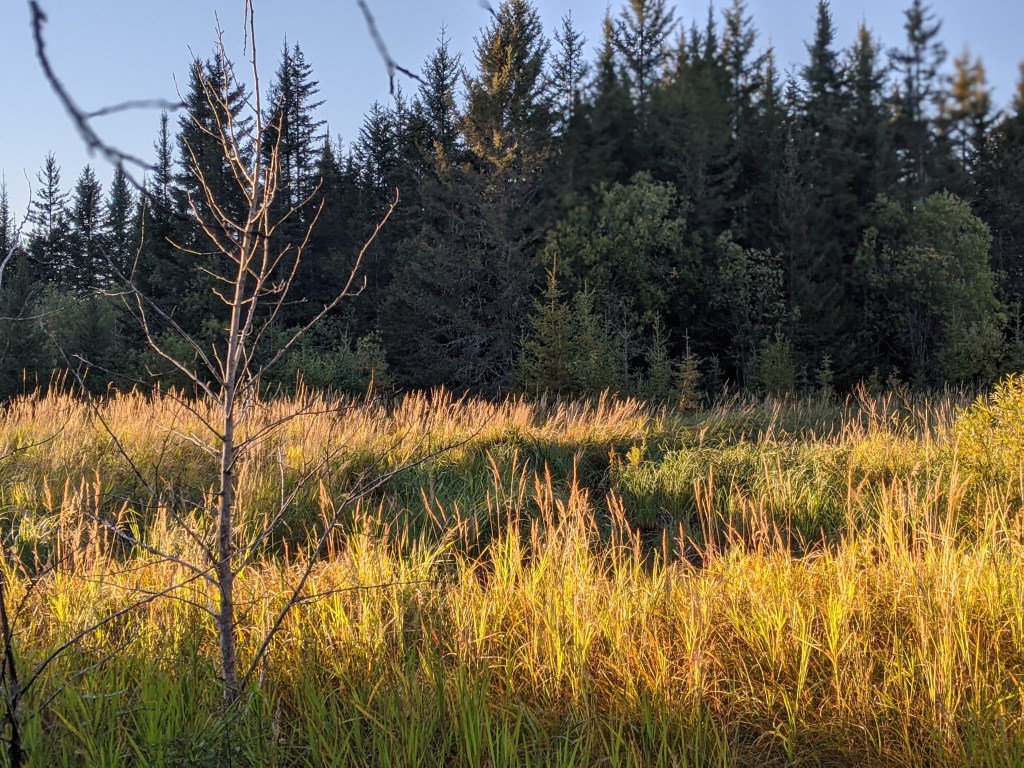 On the mile long lane that leads to our clearing, we stopped our vehicle to watch the sandhill cranes feeding. Their couple dances, graceful wing spreads that lift them lightly though they’re large birds, are fascinating. The Canada geese have gathered here again too, feeding and waiting for the signal to fly to their other summer place. The field itself where feeding, dancing and waiting happen is an ocean of fall grasses, heavy heads of grain, dipping and flowing with the wind.ย