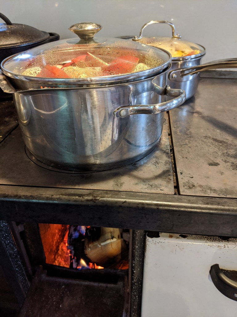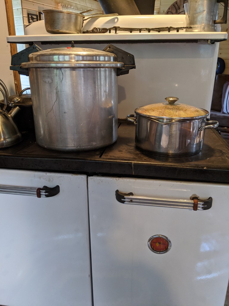 It turned out just as I anticipated. I’ve been looking forward to canning on the cookstove for years. The idea that I could cook the apples and water bath the sauce filled jars at the same time on one surface over one wood fire using no LP or electricity makes me feel triumphant.
