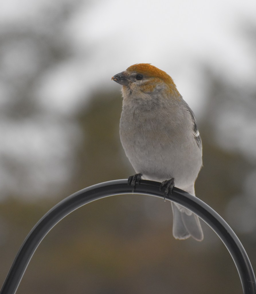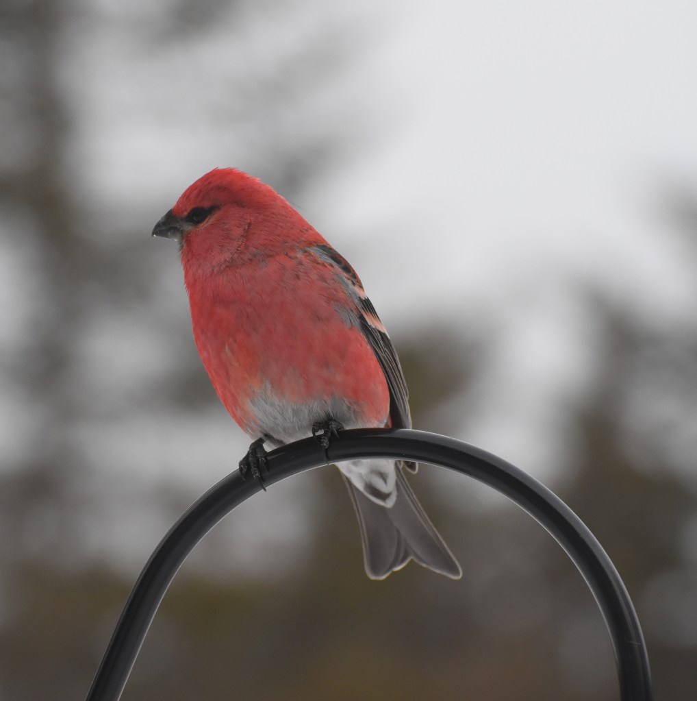 I honestly believed that once settled in at the cabin with plenty of time on my hands that I would get started on my list of what I really wanted to do in life. What I failed to take into account were the boundless distractions of living in the woods. I used to think that bird feeding and watching was for old people. I don’t know if this means I am old or if I was wrong about that. Anyway, I am seeing birds I did not know existed before. These in the pictures are pine grosbeaks. They come to the feeders in flocks and they like to feed off the ground best because they’re big birds that don’t fit well on the feeders that the chickadeed love to use. Last weekend when the children were here for Elv’s birthday, Clark took these pictures and let me have them.