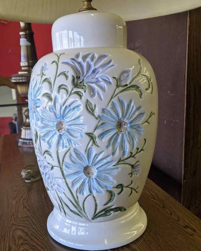 And then there was the lamp with the happy, blue daisies. I really liked it a lot. The daisies are not just painted on the flat surface; but are deeply shaped into the glass or maybe it’s glazed pottery… could be.(I looked it up, it’s ceramic. It’s also truly vintage and possibly worth a few.) But I don’t need this lamp and the shade was in bad shape. I settled for taking a picture and left it there. But I really wish to own it. I fear I’m in great danger of setting my affections on things of this earth, again.