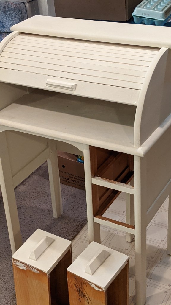 Elv bought a tiny roll top desk at the school fund raiser auction. It’s going into the children’s library play room, also in our “real” house. It is where the craft supplies for the grandkids will be.