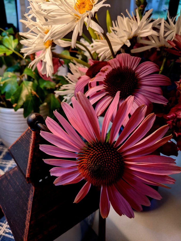 Then it’s copper next to bronze. And the cone is orange or maroon depending on the lighting. The flowers last in a vase for weeks literally, on the cabin table. It’s friendly to come back in the door three weeks later to be greeted by these keepers.