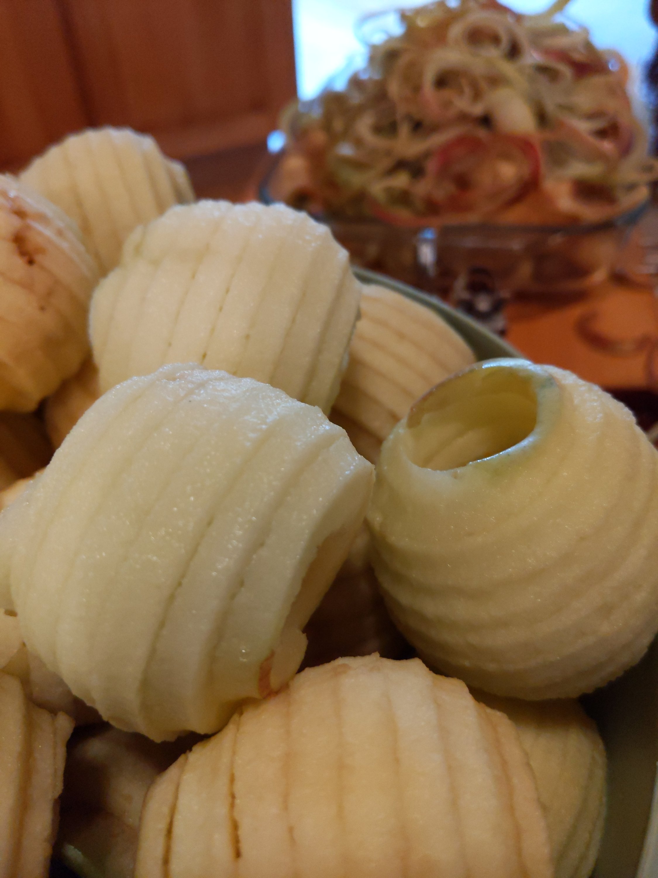 - Apple pie filling from free apples. Even the small green ones from the shaded side of the tree came off the apple slicer in lovely coils. I’m canning alone this year. I could ask for help, but I’m enjoying the unhurriedness of having all the time I need. Of making ordinary kitchen work my own art.