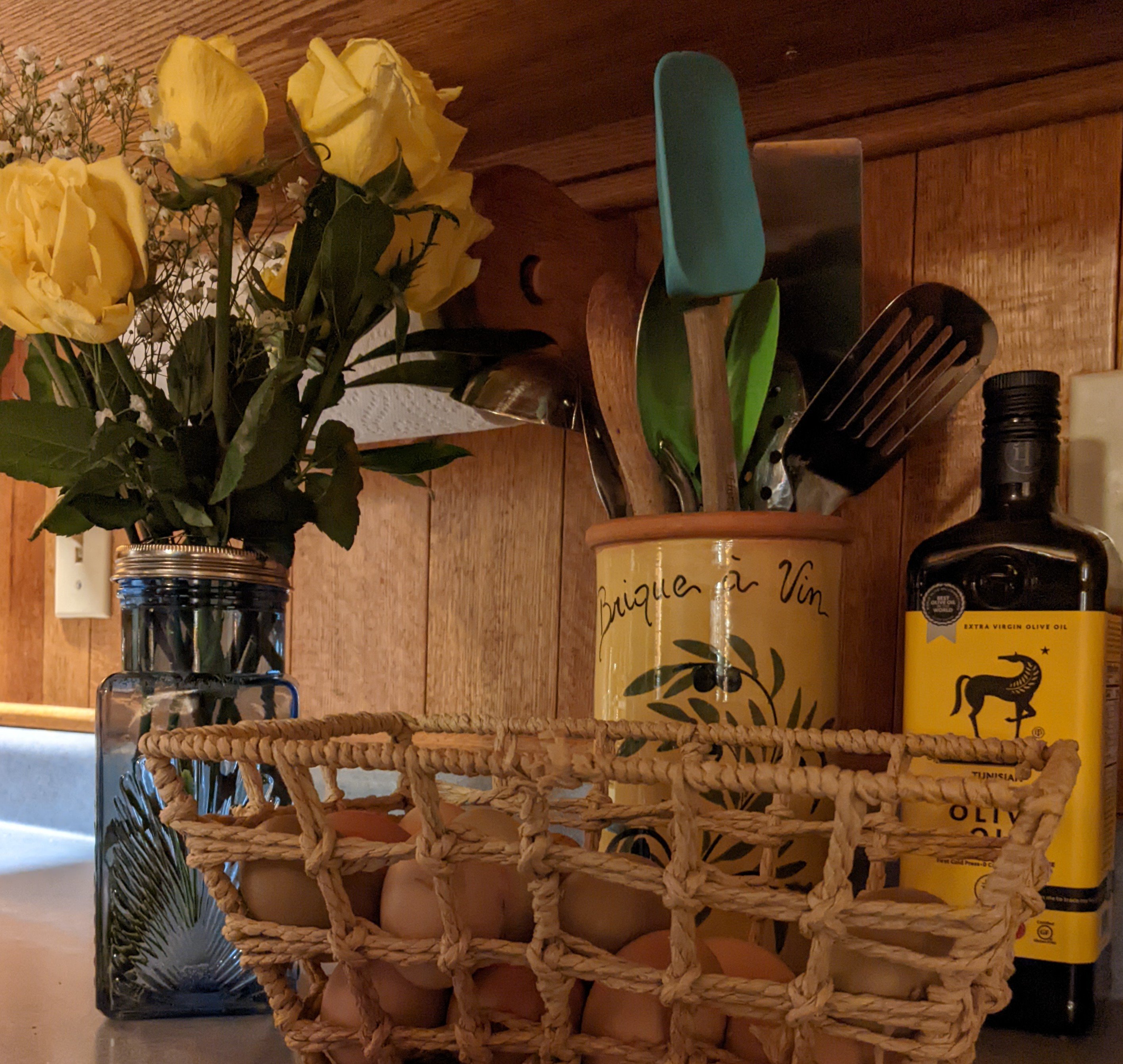 It’s also one of the best home creating times. The sun is doing lovely things to the snow and the living spaces more and more each day that it shines. In February, you can feel the sunshine and the Lord only knows how badly we need that. I frankly must sit in the sun this time of year. But I was talking about creating. I need clean and simpler decor and yellow. So yellow was happening out in the kitchen the other evening. I tried to capture it. It blessed me, anyway.