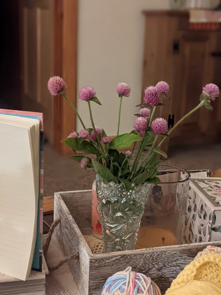 - In a pretty tray: Grandkids pictures, a candle, lotion, another vase of flowers from the garden today that probably should be dried, not in water. And a lidded box within which are a couple decks of Rook cards.