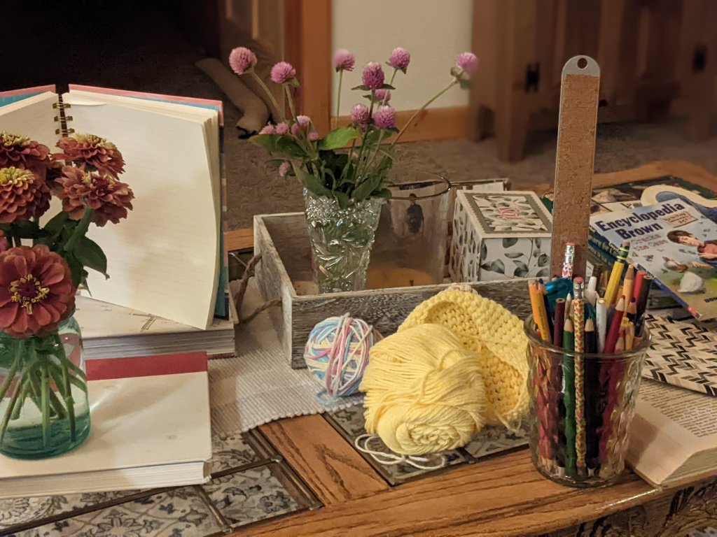 Those zinnias are perfection. My coffee table just has one plant on it. And usually mugs and earbuds the kids leave lying around.