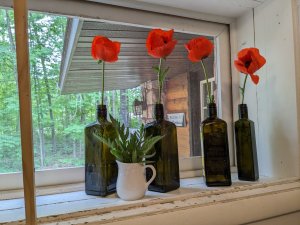 I know, you’ve heard all about the poppies and peonies the last few days. But isn’t this so pretty? Olive oil bottles of heavy, green glass that I couldn’t throw away have now been put to use.