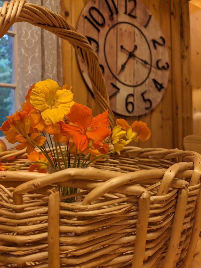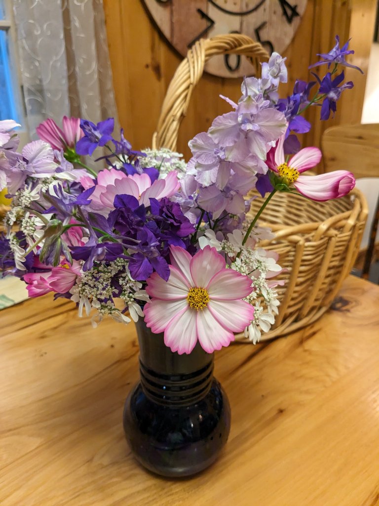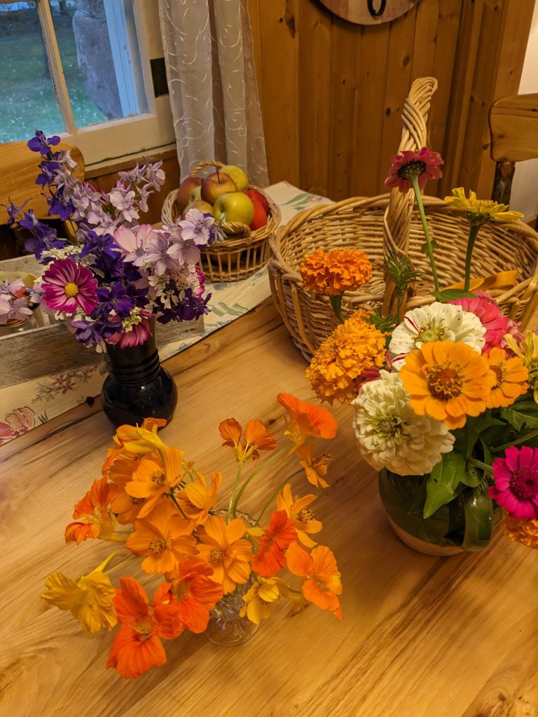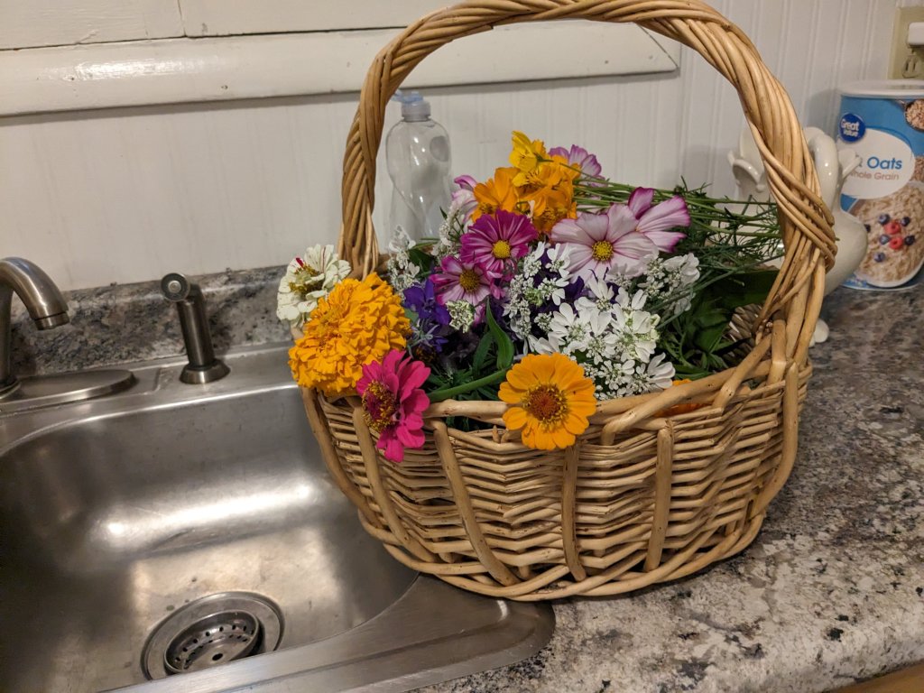 The funny, flowers-no-vegetables garden is yielding baskets of cuttings for vases. Yes, I’m going to do this again. Only thing, next year there’ll be veges and raspberry plant starts from my mom. With frost weeks away, she says hopefully, there ought to be plenty of bouquets to come and then seed saving.