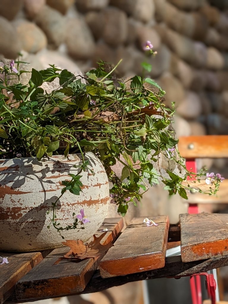 I finally made a mug of hot chocolate from Grace’s mix and grabbed my journal and a heavy throw and came out to the patio. Of course I noticed that one of the potted plants needed watering, till I could settle. Elv made a snide crack about my restless soul, but from behind his book, and promptly forgot me.