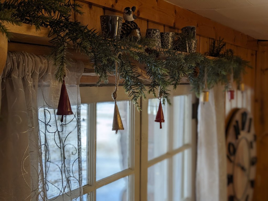 I love these simple little bells, red or gold tin bells handcrafted somewhere far away, sold in our store for a dollar and a few pennies. The pine garlands hold them perfectly.