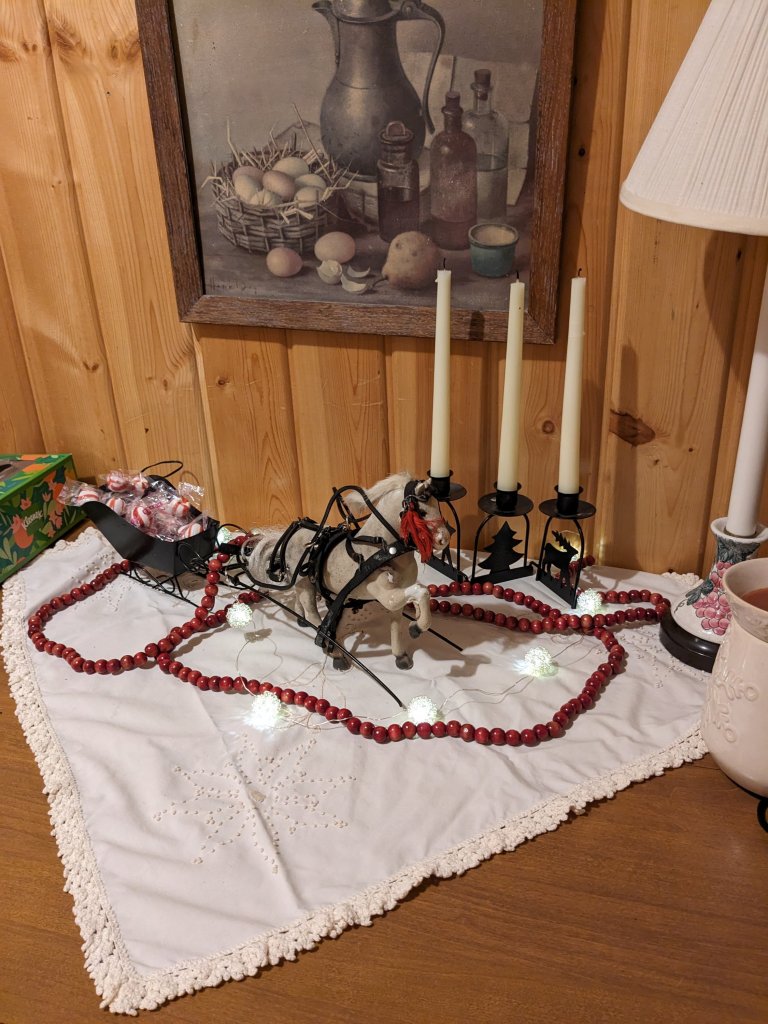 The horses need to be hitched properly to the sleigh. Who can help me? Dad Graber made this many years ago gifting it to me. We’ve enjoyed many peppermint sleigh rides at our house at Christmas time. My mom made the little table cloth. I realize that we have our own unique collection of Christmas things to pull out and enjoy each winter. What better way to gather up the memories of yesteryear and spread them around to collect more from each new Christmas.