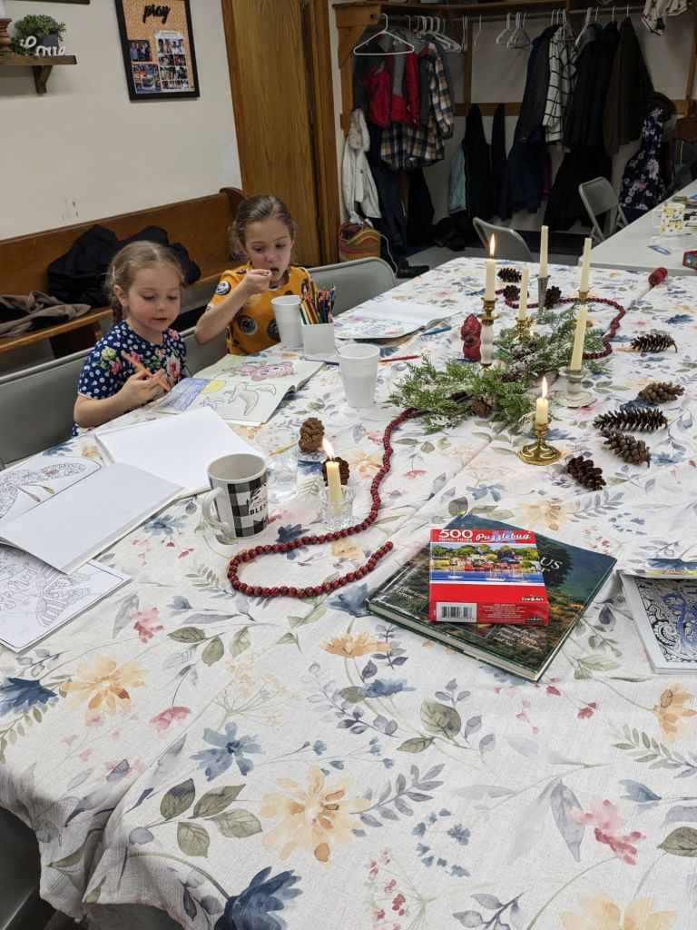 We did all the things: gathered around nice meals and charcuterie and board games. There were visits in small groups of us girls while the men and children logged a lot of Catan and a bit of Rook. Some of us who like to, went into the chapel and sat on the backs of pews with the Church Hymnal harmonizing over Oh Sacred Head and lots of other beautiful pieces. We ate too much, and played hard making huge crazy messes that had to be swept up at least by day’s end.