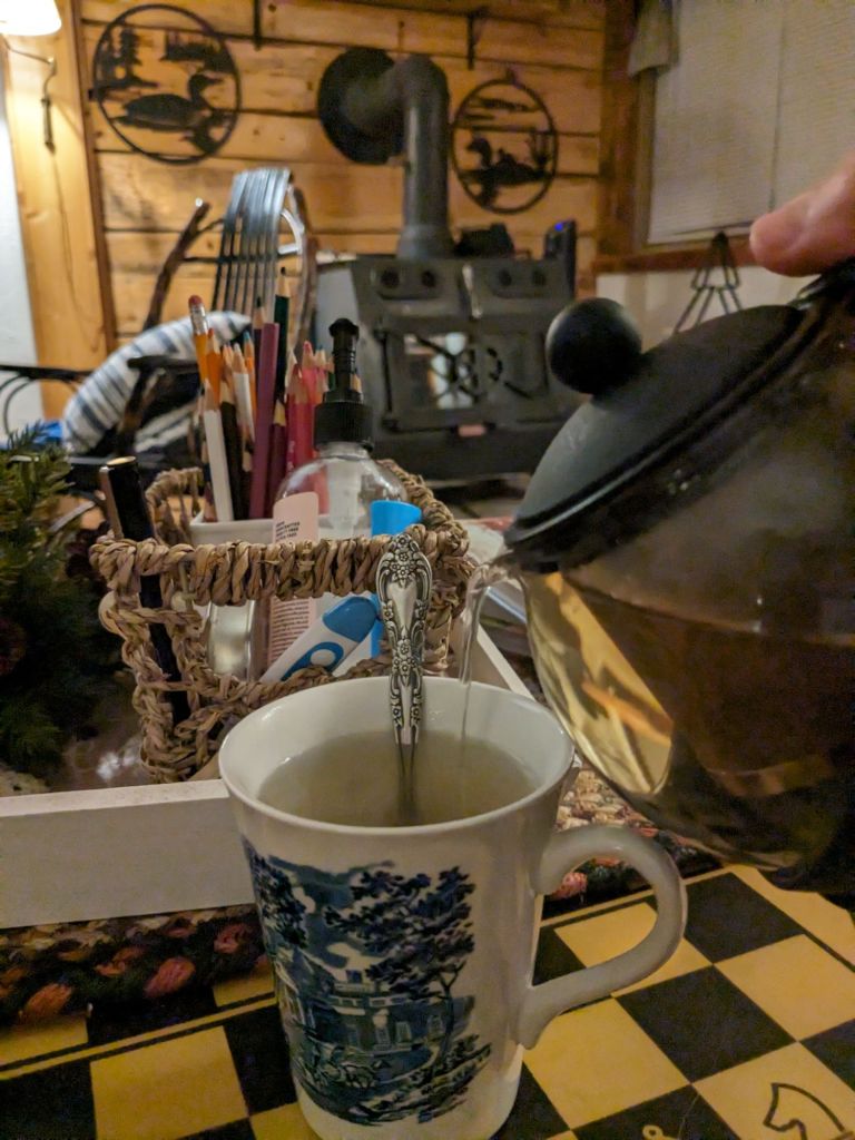 It’s Saturday evening. I’ve made tea of the Chamomile variety. Apparently, Elv is going to continue into the night with his project of transforming the basement utility room into a bathroom. Most often we play Scrabble in the evenings between reading or listening to music. So I have tea alone, unless you count yourselves as my company.