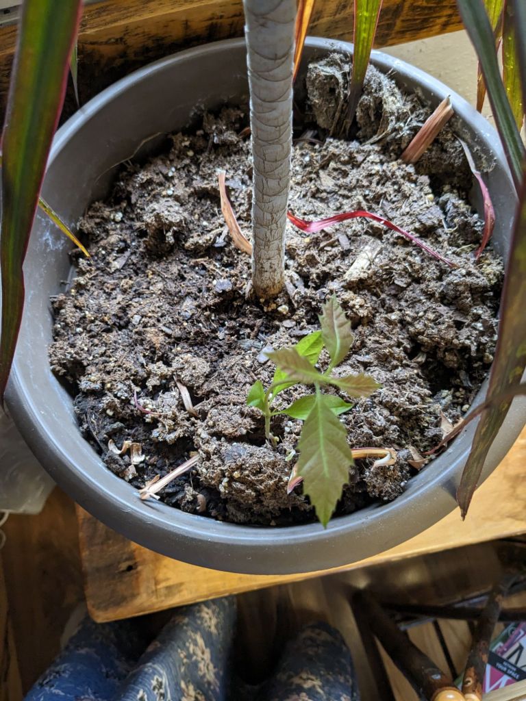 This potted plant lived outside on the patio last summer and a chipmunk kept digging a hole in the dirt in the pot. Now I realize that he was trying to store acorns. I think this is an oak sprout anyway. But my judgement is just wonky enough in a couple other places in my life; if any of you have a better way to identify this baby plant, please do.