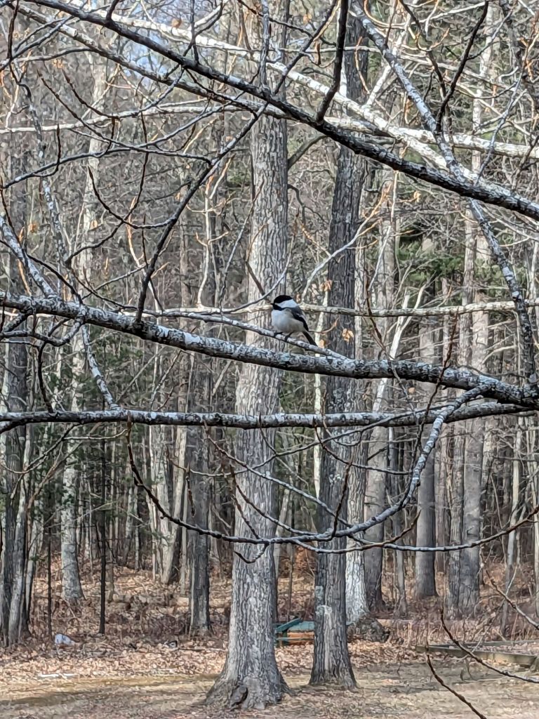 I am pretty sure my smart camera provided the extra clarity with a filter for my chickadee in the tree here. Or maybe my camera really can get it that clear? I’m leery of it. I’m pretty sure I was too far away.