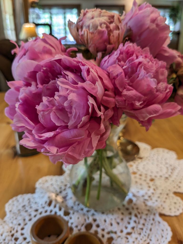 This week, Elv mowed the lawn, so I have time to have a slow day. For the first time since I was sick I got to do ordinary things, at my leisure. I had coffee with Lisl who showed me her gardens. I washed eggs and stirred up cinnamon roll dough. Tonight, there’s a chorus group performing at church and we are planning to go.