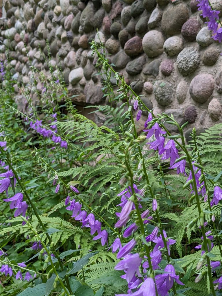 Campanula has taken to growing all along the back of the stone house. Apparently it grows in poor soil just fine. And it’s good that my threats to mow it down didn’t happen.