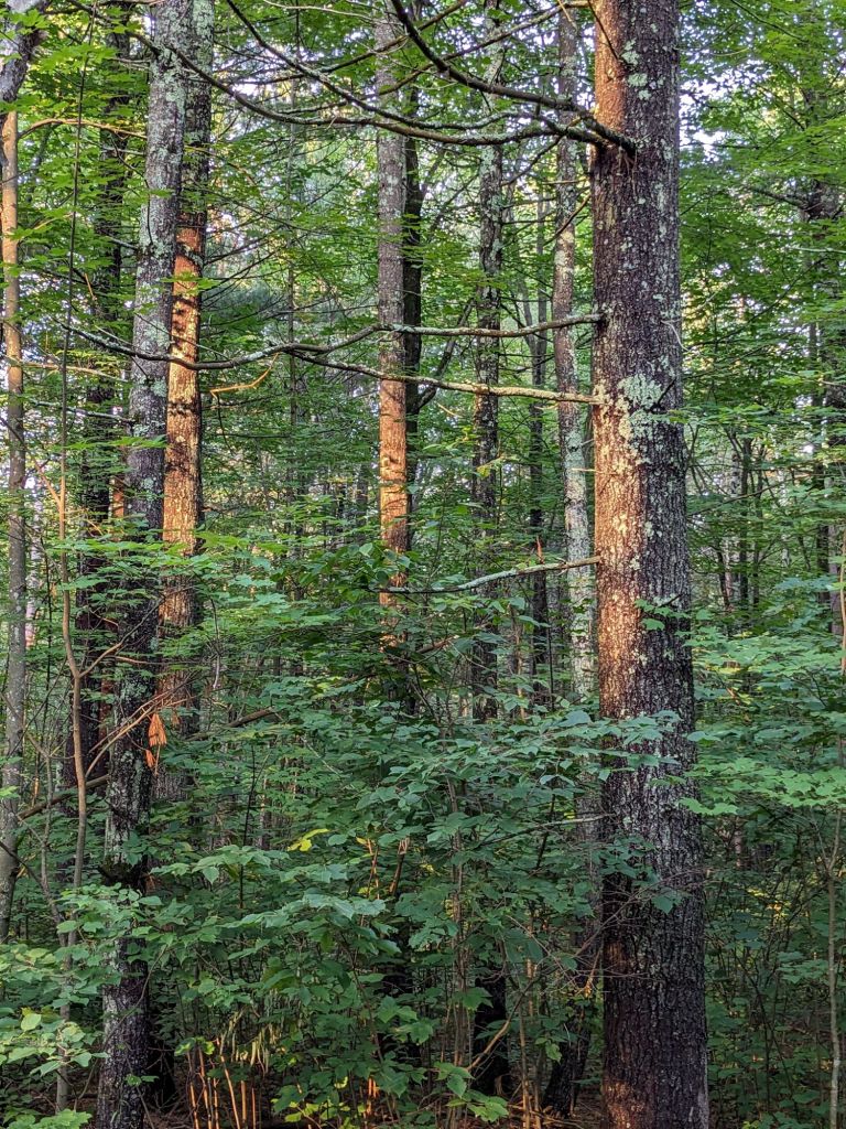 We took our walk during the golden hour last evening. The woods are deep and open, a heavy canopy with mature trees allowing us to see in. The tall straight red-pine trunks stand out, almost pink, in this light. We gaze into the depths and I kind of wish we could see that sow bear with her four cubs that live here this season. But she’s not around apparently. She would rather lead her babies past dumpsters and decks on her own eating and hunting schedule.