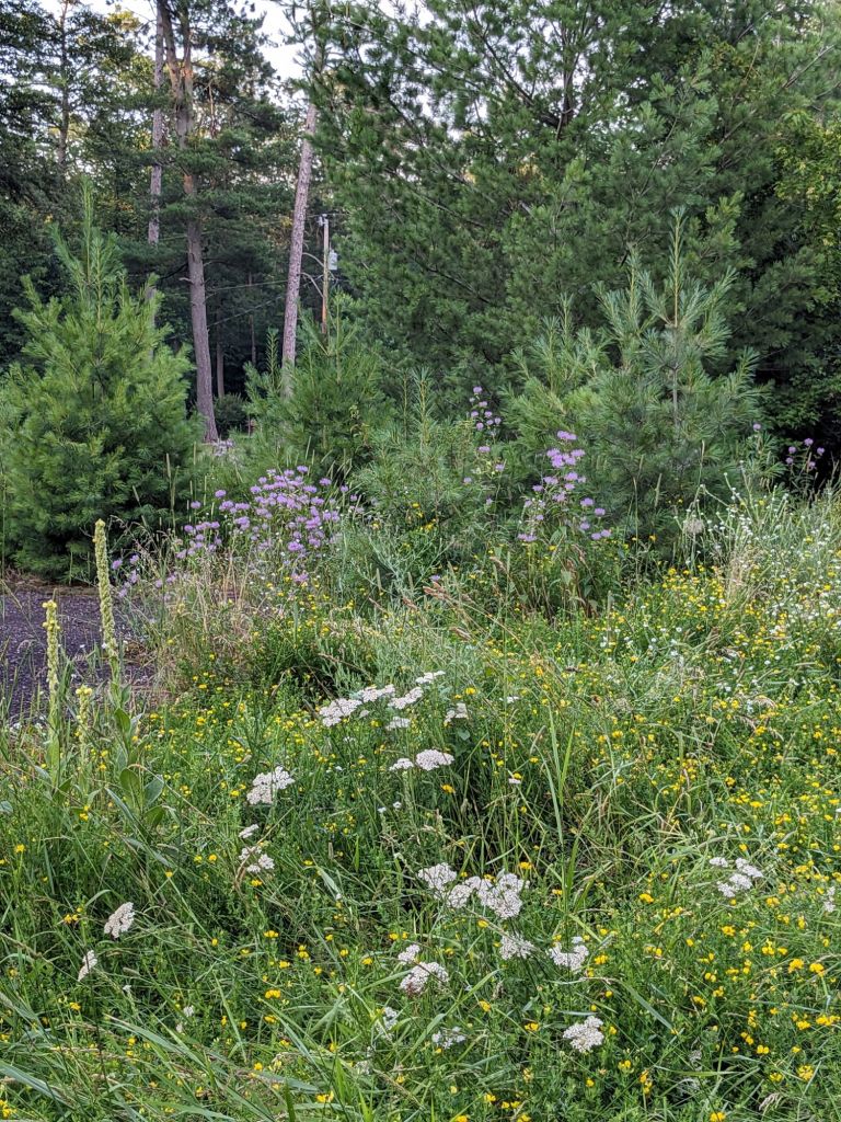 Yarrow, mullein, bergamot, bird’s-foot trefoil, and daisies collect along the road right here in our little village. There’s a patch of old forgotten black top in the midst of this wild flower patch. Forty years ago the old hotel was razed and the woods and flowers are taking over.