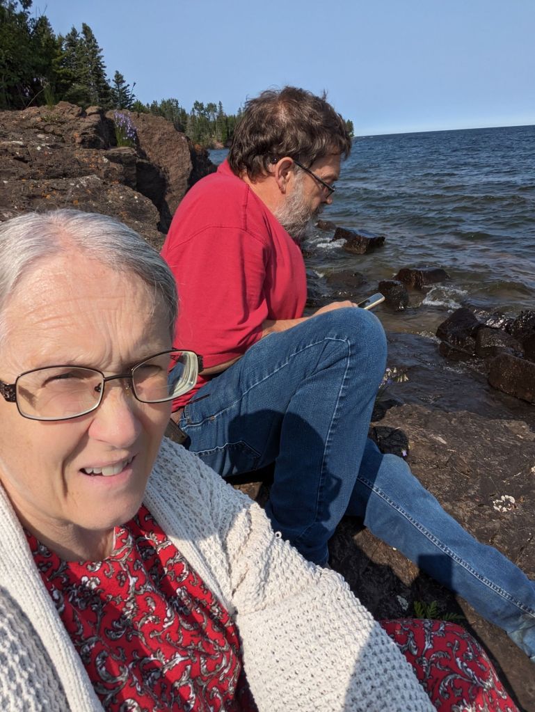 Please don’t notice that Elv is looking at his phone. “Biden has dropped out.” He said, but I am too absorbed in the waves to care. White caps and sea gulls added interest to the waves. It’s better to find yourself a comfortably shaped rock and nestle in for a good long look at the movement and color of the lake. The more you look the more you’ll see; besides the swish and splash of the waves at your feet will clear your head. Clear your head of the news noise. And thank God, He still thinks beautiful lakeshores are important for us.