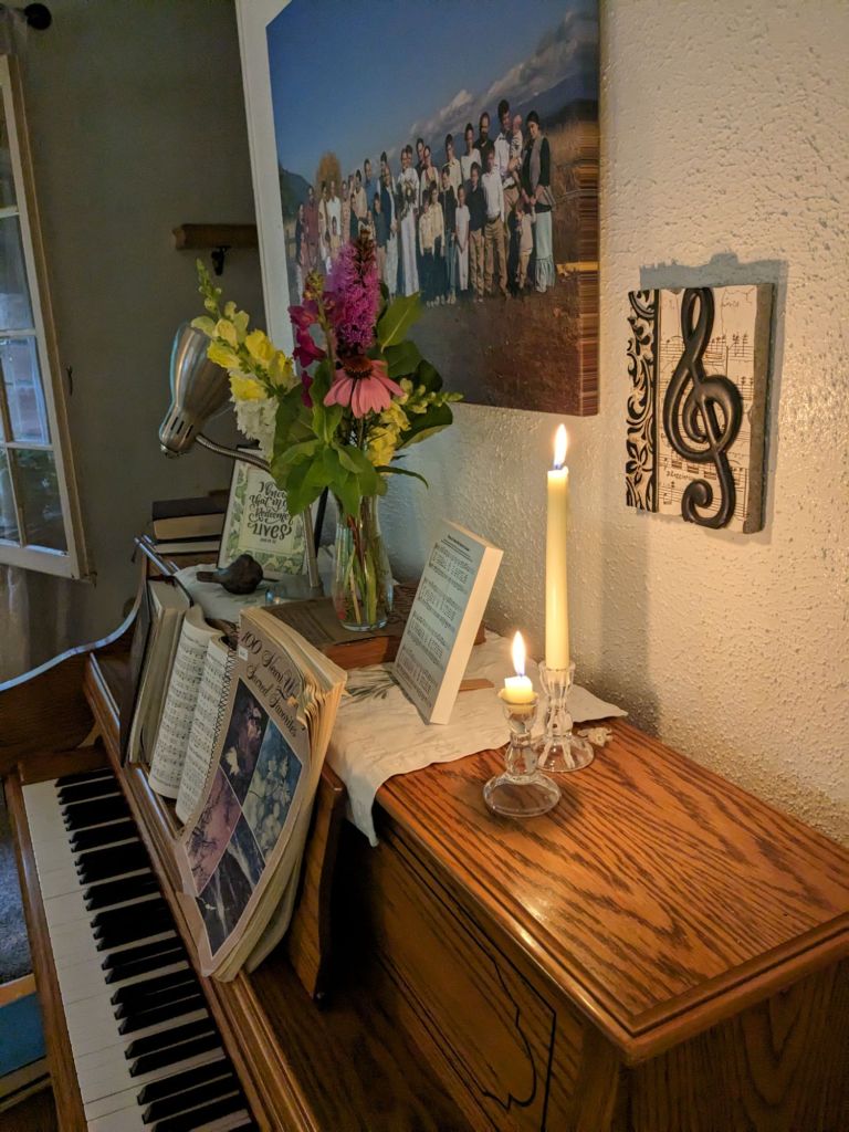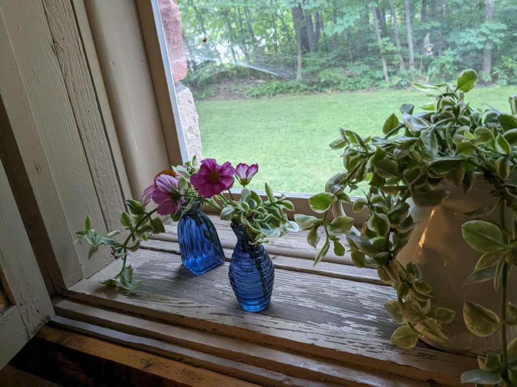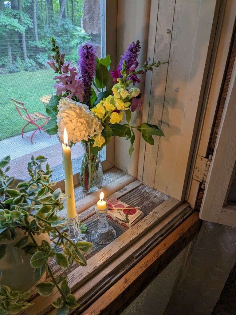 It’s a cozy kind of evening now. Everything is dripping wet outside, while inside the glow of lamps and fresh flower bouquets are cheerful. I still have laundry to put away and dishes to finish up. Elv is done for the day, and saying the woods are going to be too muddy for tomorrow. But there’s always mechanical work.