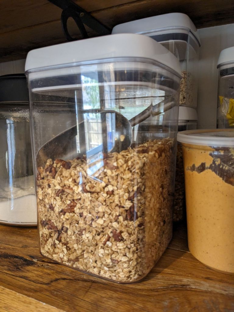 I seldom, almost never, make granola. But I found a simple recipe and method that doesn’t involve fancy ingredients that are not in my pantry. I get double pleasure out of this little win. It’s beautiful on the shelf and it’s breakfast.