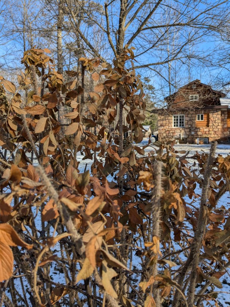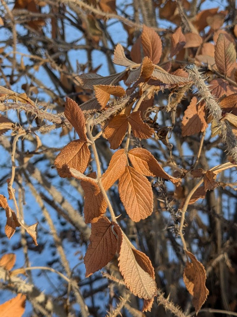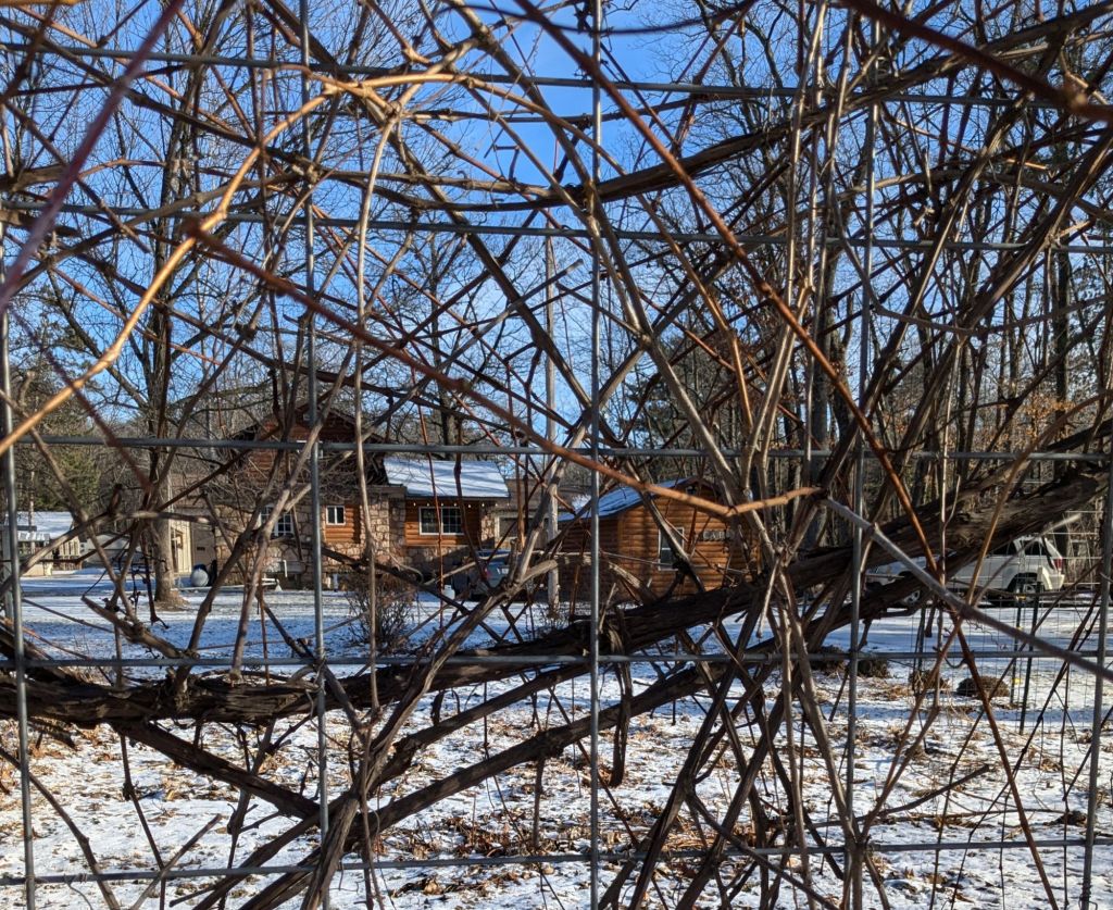 There’s such beauty in rusty rose leaves against the warm wood and blue snow. Monty says we should go out there every day that we can, even in January. I wonder, maybe a bench in the grape arbor would do.