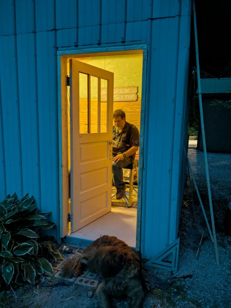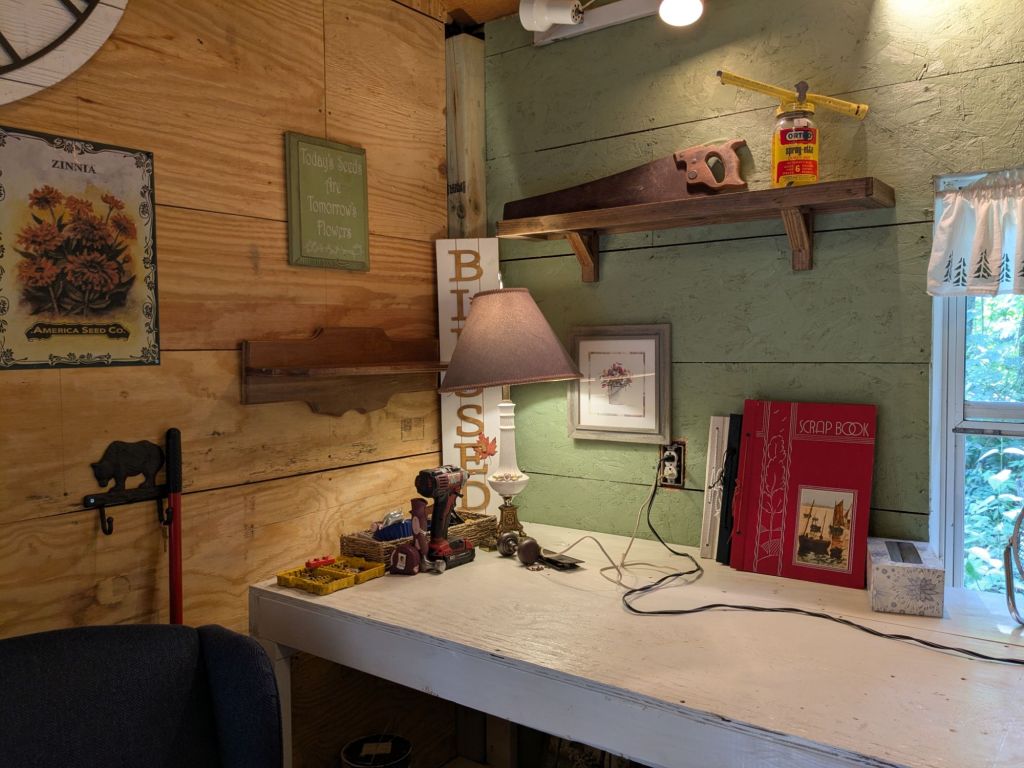 I started to see possibilities that I hadn’t noticed before. If Elv is going to spend his evening hours puttering in his new shop, I thought to myself; I must have a spot nearby of my own to play and putter in, as well. It’s insulated and paneled. There’s a window. I could paint and decorate and equip it for storage and a work space and who knows what all.