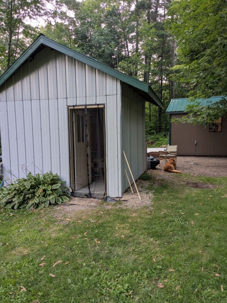 I had Elv’s support. We had thrown the old and battered door away before the concrete came, so that was one thing I couldn’t fix. We looked for a door. I wanted an antique door. Turns out I had one right under my nose. Years ago, I inherited an old interior door from Grandpa’s Conrath house and had happily used it as the door between the dining room and the porch. That door kept a lot of porch heat and cold and drama out in the porch where it belonged for many years. Then we remodeled the porch: new windows and a little insulation, so the door was more of just a treasured heirloom that we left in place. It still kept a lot of drafts out, too. Anyway, now it’s an exterior door on the she shed. Elv had to cut it down to fit and reframe it and install a modern lockable knob. I kept the old knob. I have half a mind to put it back on because the new one got a fresh position on the door. But whoever heard of two sets of knobs on one door? But then whoever heard of turning an old dirty shed into a bedroom/she shed?